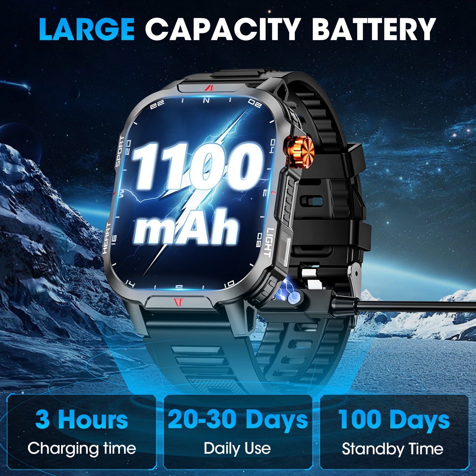 1100mAh High-Capacity Battery: Our smart watch is equipped with a 1100 mAh high-capacity battery, support 20-30 days of daily use, 100+ days standby, minimizing power consumption, Long-lasting battery life so you don’t have to worry about frequent charging