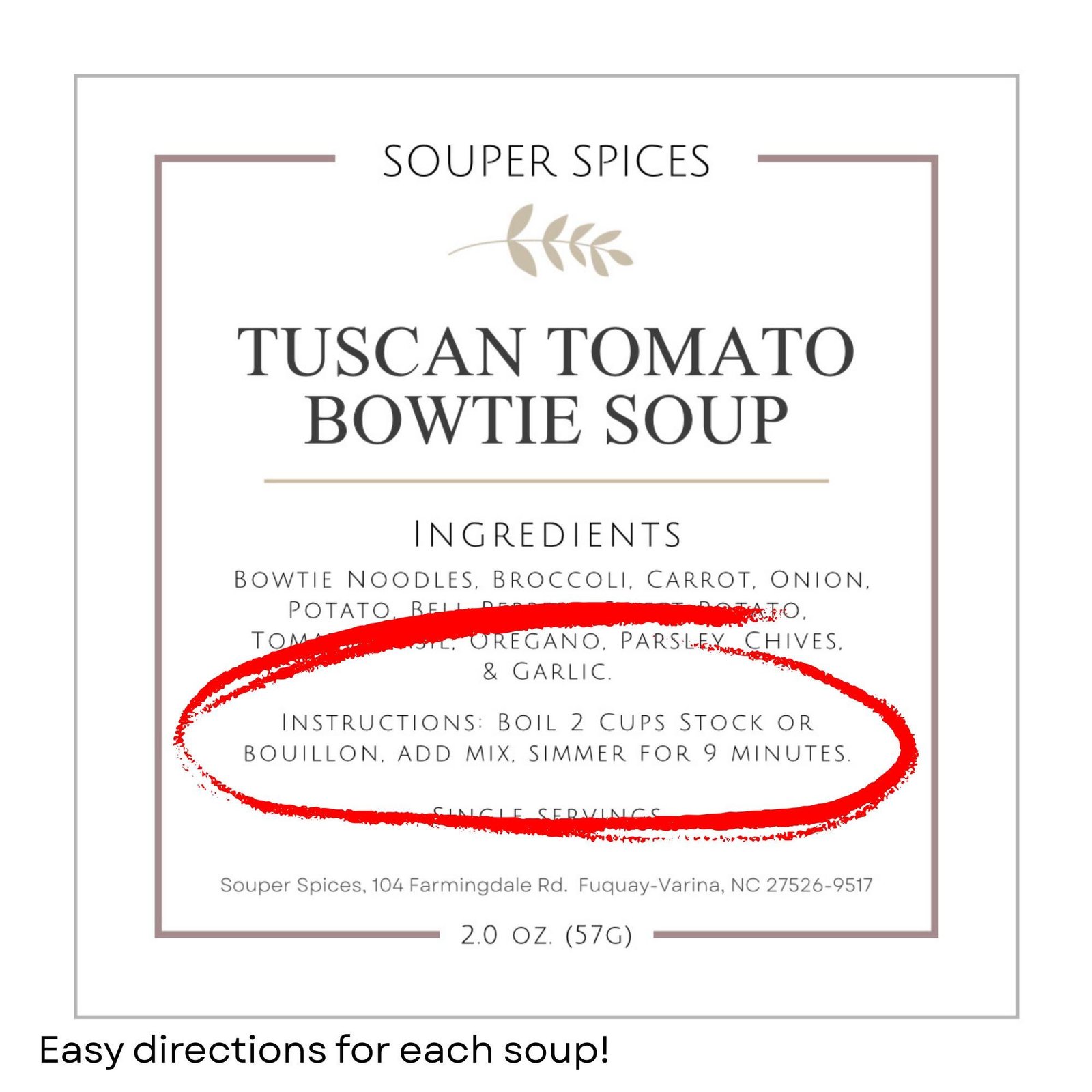 • Tuscan Tomato Bowtie Soup 2.0 oz/57 g: Rich, savoury, and full of flavour.