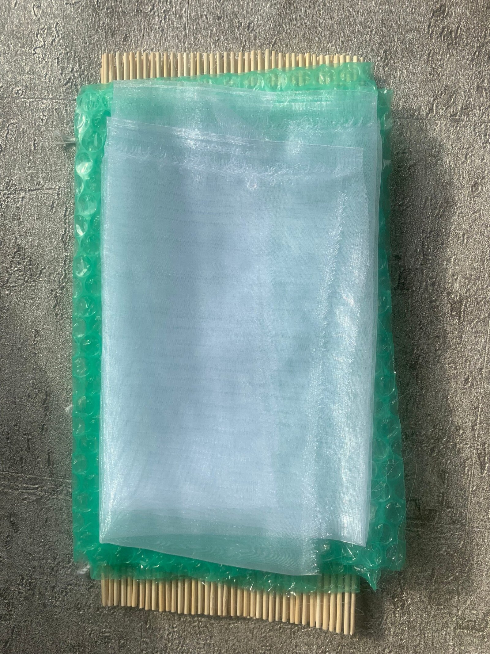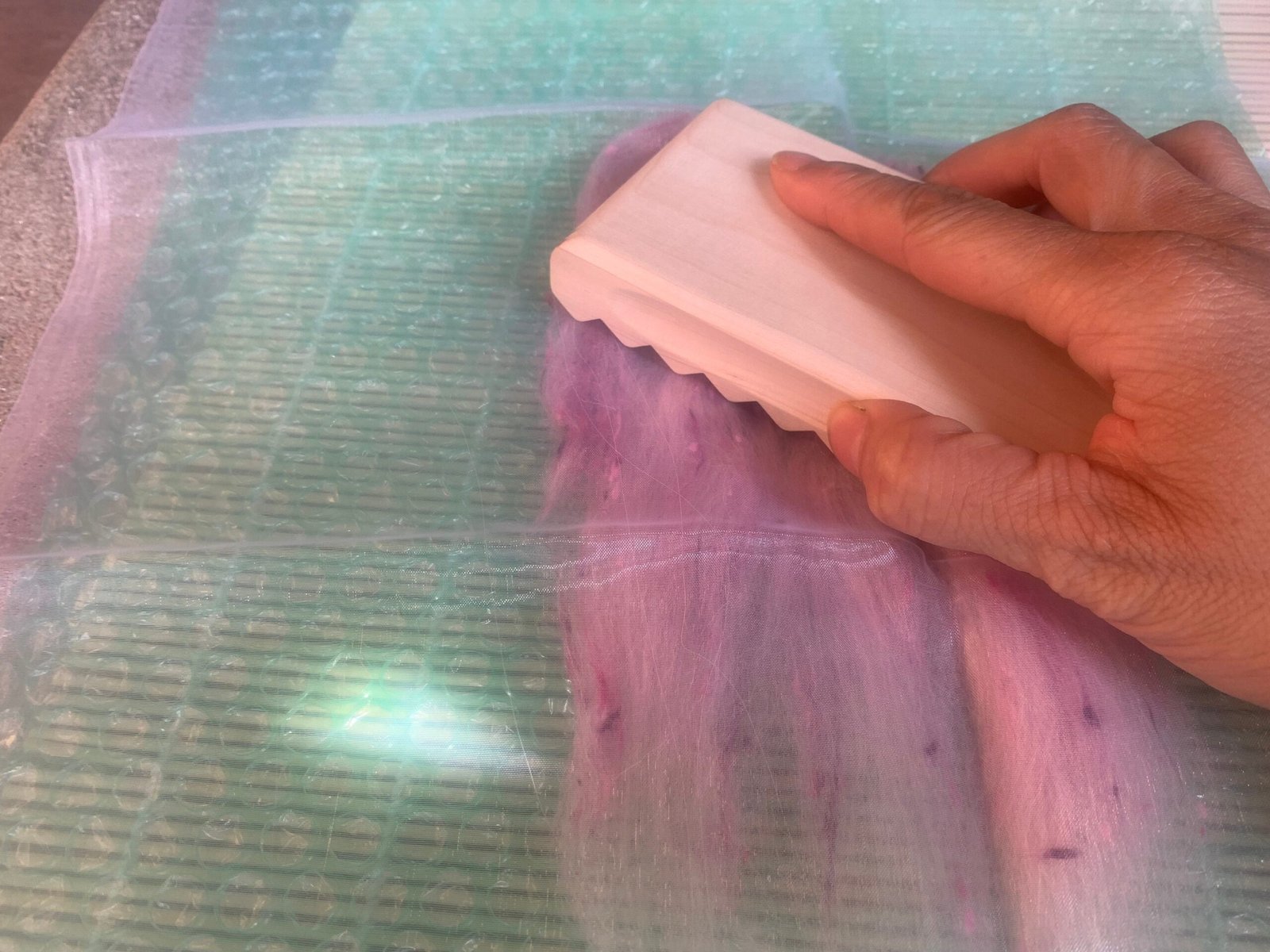 The basic wet felting kit includes a bamboo felting rolling mat, with a piece of voile netting and a sheet of bubble wrap.