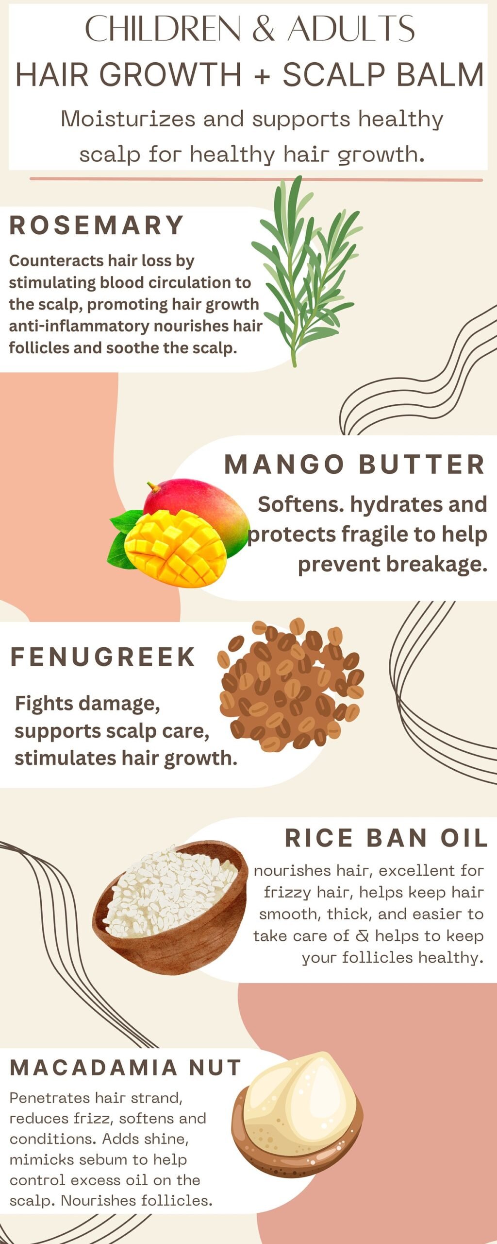 Scalp stimulating hair growth balm with skin soothing and hair growth stimulating ingredients safe for all ages.