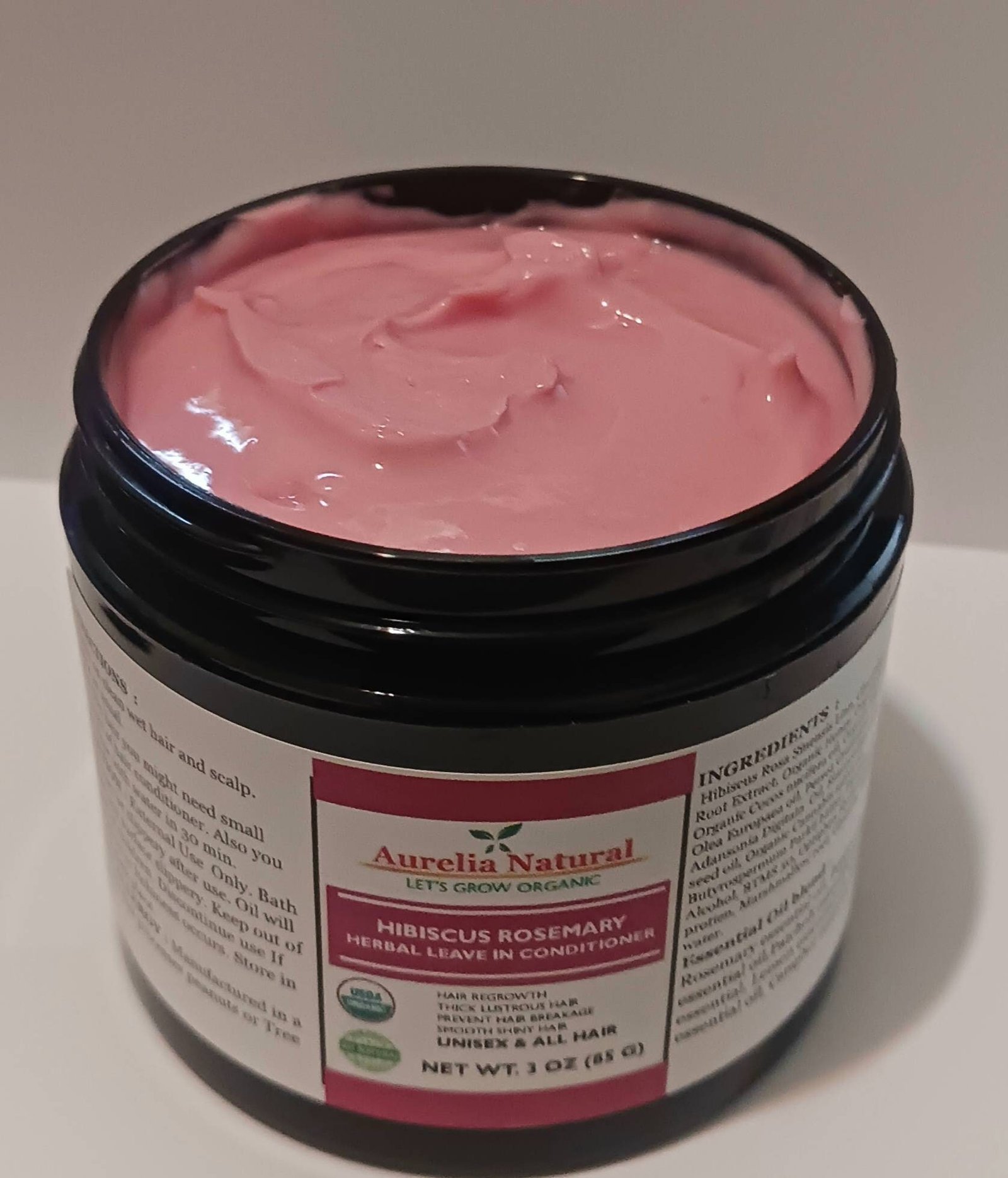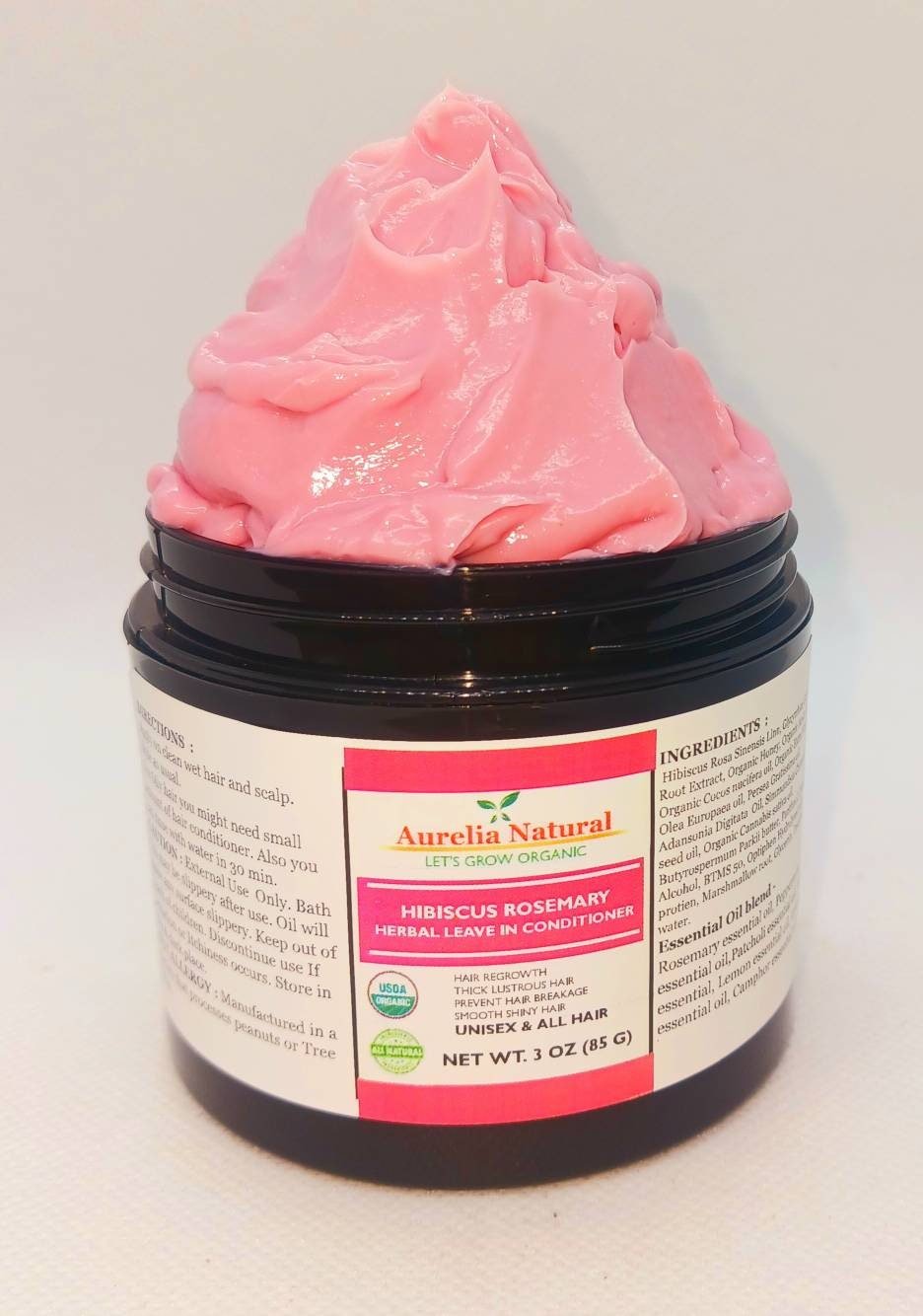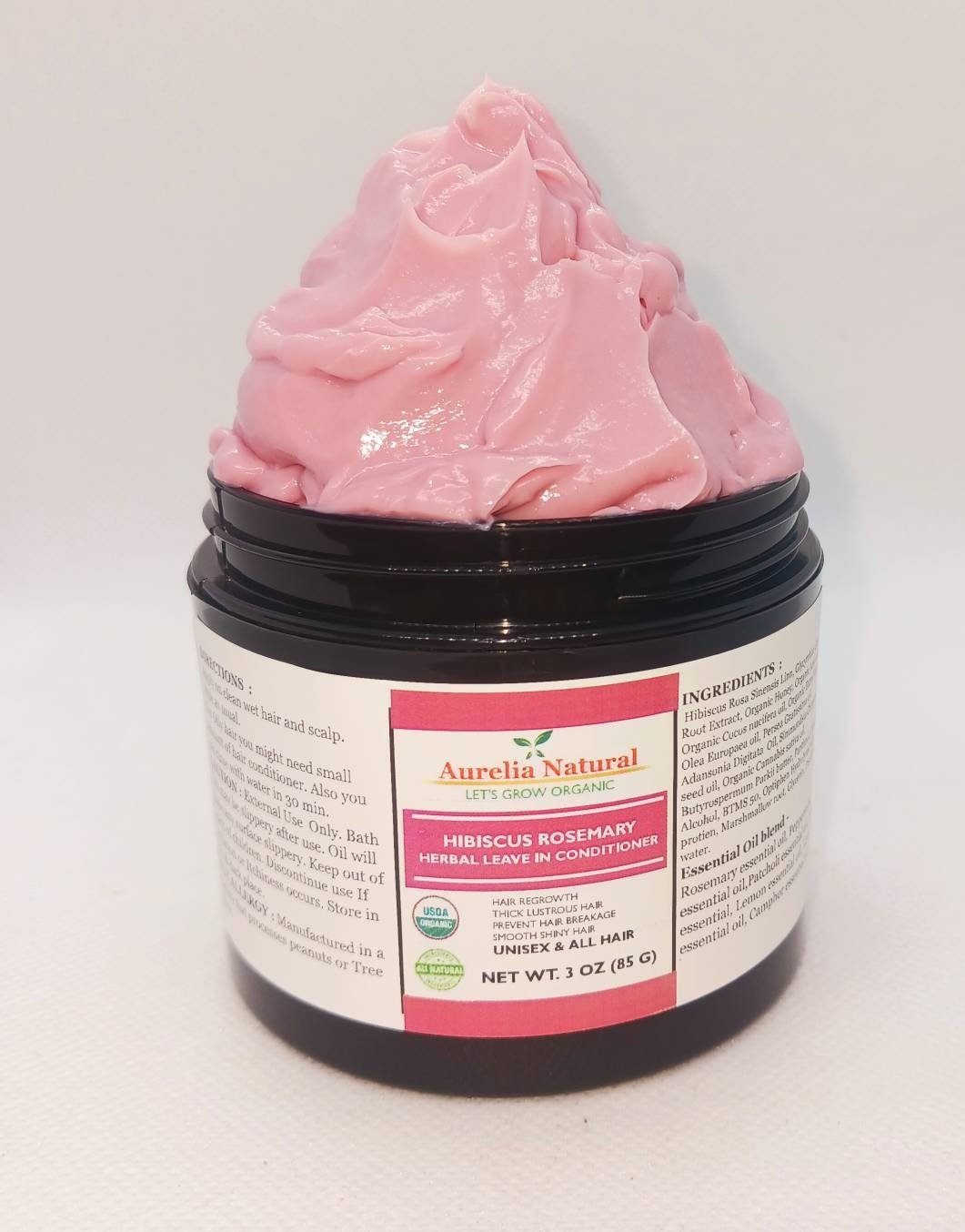 Oil – Organic Amla Oil, Organic Coconut Oil Cocos nucifera oil, Organic Extra Virgin Olive Oil Olea Europaea, Avocado Oil, Baobab Oil, Organic Jojoba Oil, Organic Hemp Oil, Organic Shea butter, Panthenol, Cetearyl Alcohol, BTMS 50, Optiphen Hydrolyzed silk protein, Marshmallow root, Rosemary, Glycerin, Distilled water.
