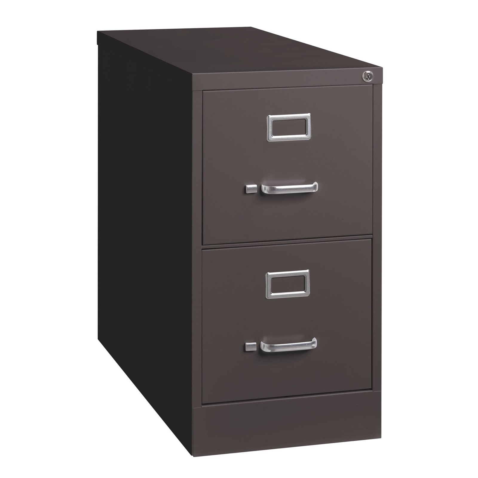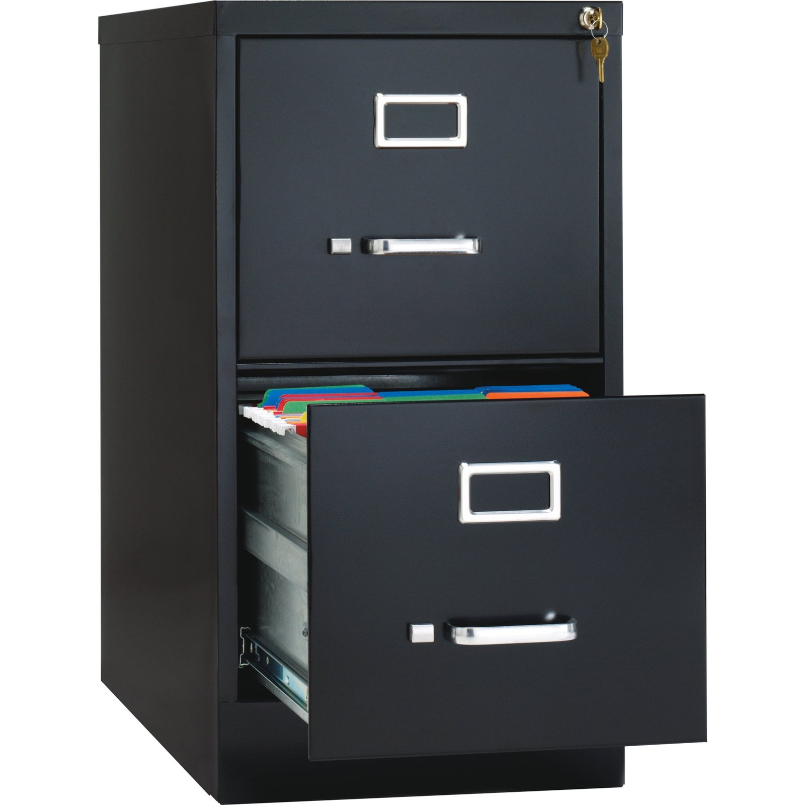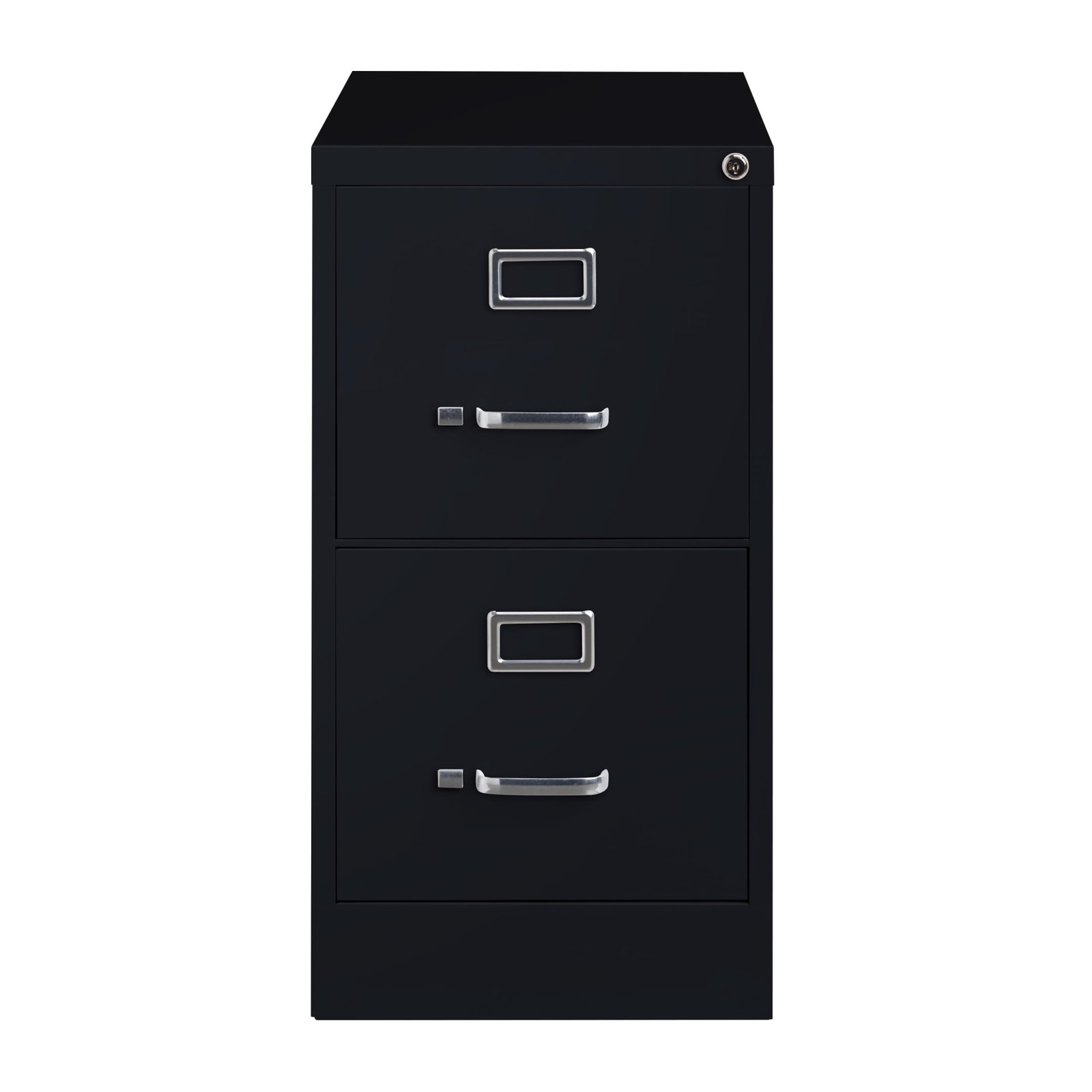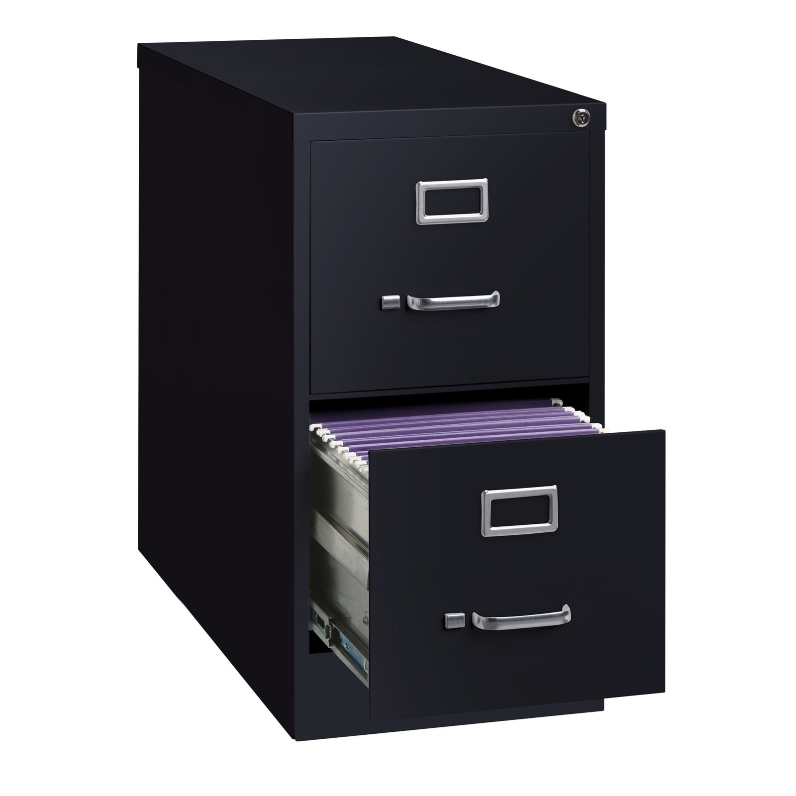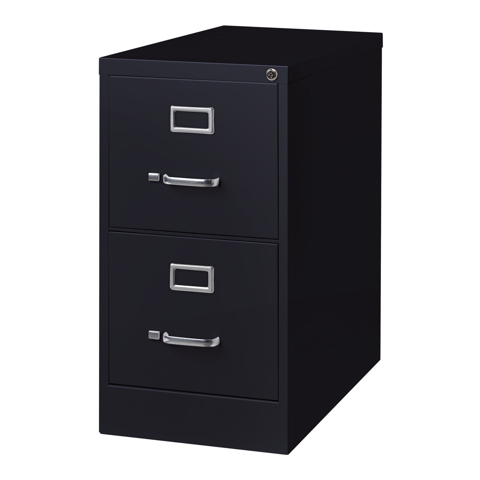 26.5″ deep metal, 2 drawer, letter width, commercial grade vertical file cabinets are perfect for business, educational, or personal offices. These cabinets feature a classic design and are constructed with high quality durable materials that are suitable for heavy-duty use. Ships fully assembled and is ready to accept letter width hanging file folders. Smooth surface is easy to clean. Each drawer includes full extension ball-bearing slides for smooth drawer action. Even fully loaded, these drawers open with ease. Adjustable follower blocks keep files upright. The included core-removable lock allows cabinets to be keyed alike. Designed to meet or exceed ANSI-BIFMA industry standards for performance and workmanship. Made with 28% total recycled content. Backed by a Limited Lifetime Warranty. Color: Black