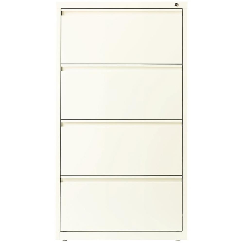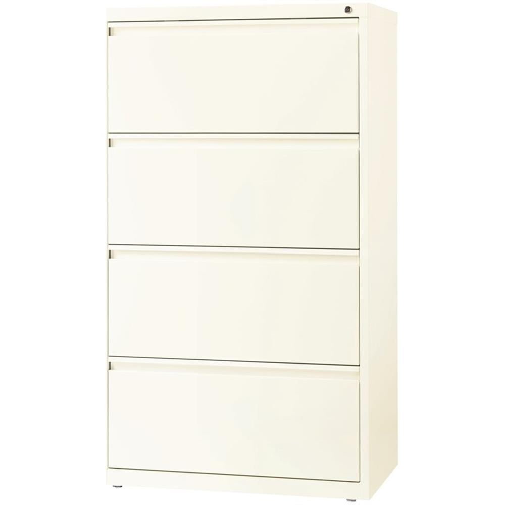 This 30 in. wide metal 4 drawer commercial grade lateral filing cabinet cloud/off white is designed for heavy duty use, yet looks great in any office. Precision ball-bearing suspension allows for quiet use in your busy office environment. Fully assembled steel construction with reinforced base. Non-porous surface is easy to clean and sanitize. Interlock system prevents tipping by only allowing one drawer open at a time. Dual lock bars and core-removable lock come standard. Unit includes hang rails, magnetic label holders, and four adjustable leveling glides. Greenguard Gold certified for indoor air quality. Meets or exceeds ANSI/BIFMA standards. TAA compliant. Limited Lifetime Warranty.