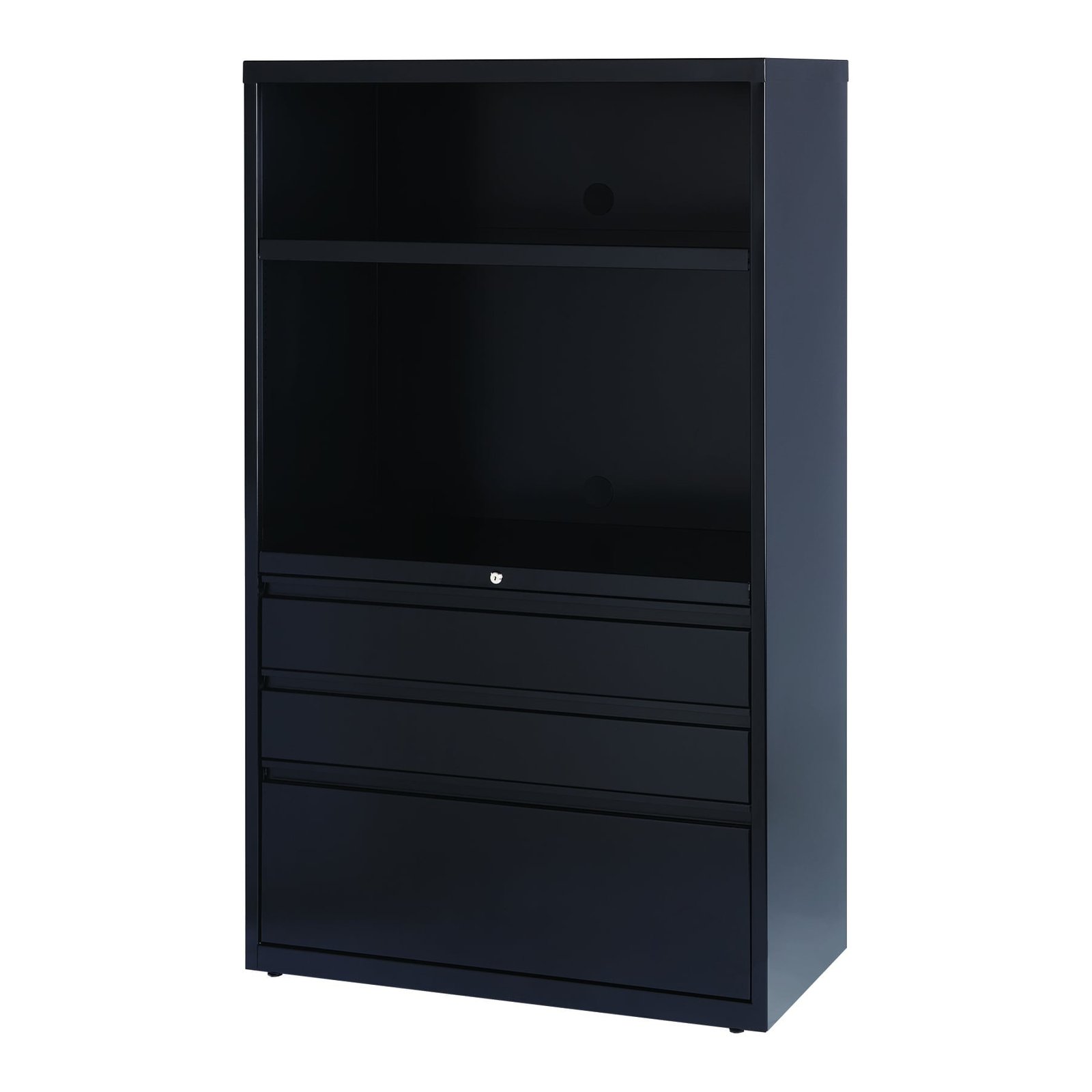 This 36 in. lateral combo file cabinet offers versatile storage options with one lateral file drawer, two box drawers and two shelves. File drawer includes hanging file rails for side-to-side filing in letter or legal-size. Shelf area includes one fixed shelf, one adjustable shelf and two grommets for cable management. Fully assembled steel construction with reinforced base. Non-porous surface is easy to clean. All drawers lock with a core-removable lock to keep your personal items safe. The full-width drawer pull design adds to the clean line of this cabinet while the powder coat finish offers an attractive durable look that complements any decor. Precision ball-bearing suspension provides smooth, quiet drawer performance. Use the included magnetic label holders for easy identification of drawer contents. Interlock system prohibits opening more than one drawer at a time while counterweight prevents tipping. A reinforced base construction and four adjustable leveling glides work to stabilize it on uneven surfaces. Greenguard Gold certified for indoor air quality. Meets or exceeds ANSI-BIFMA standards. TAA compliant. Limited Lifetime Warranty. Color: Black