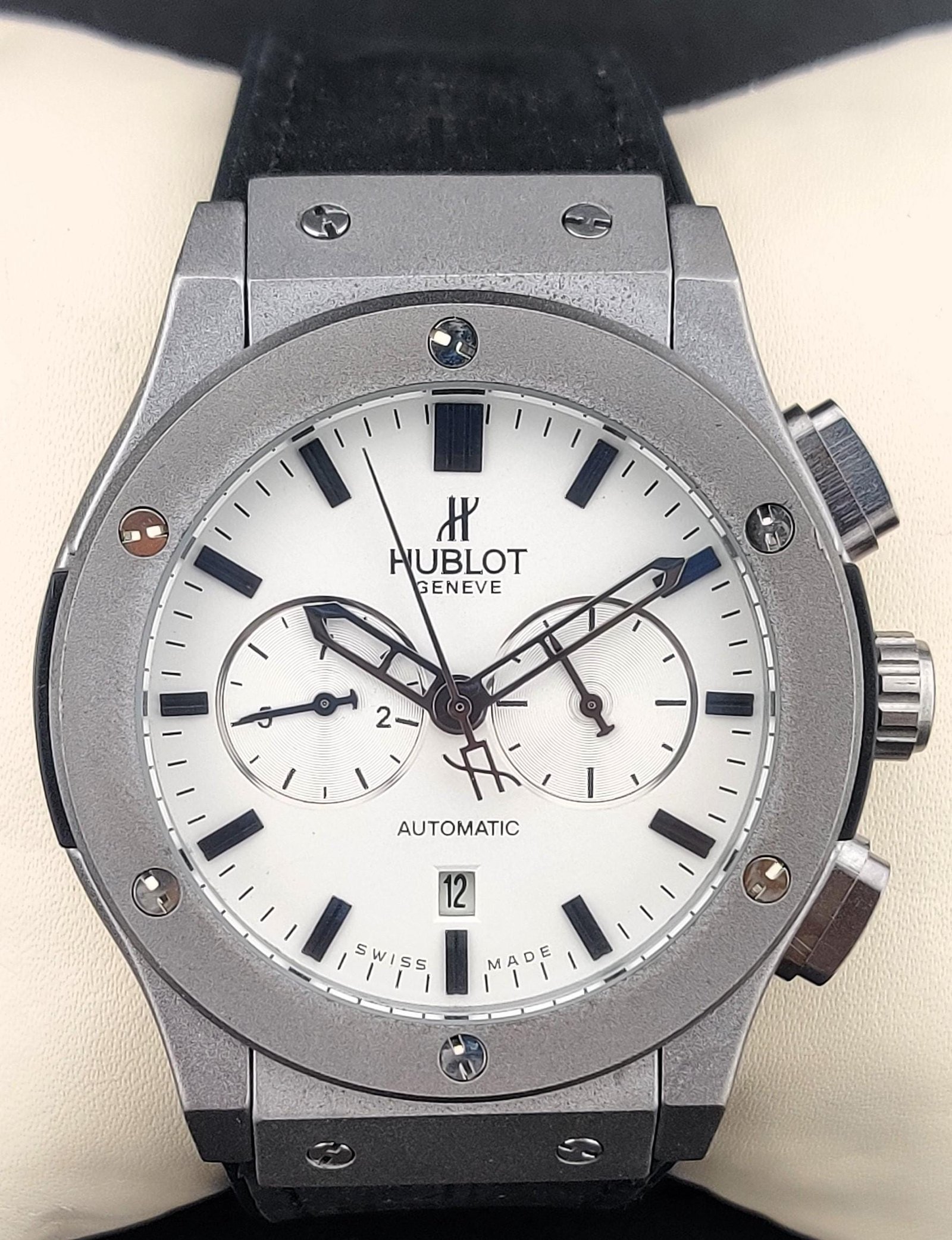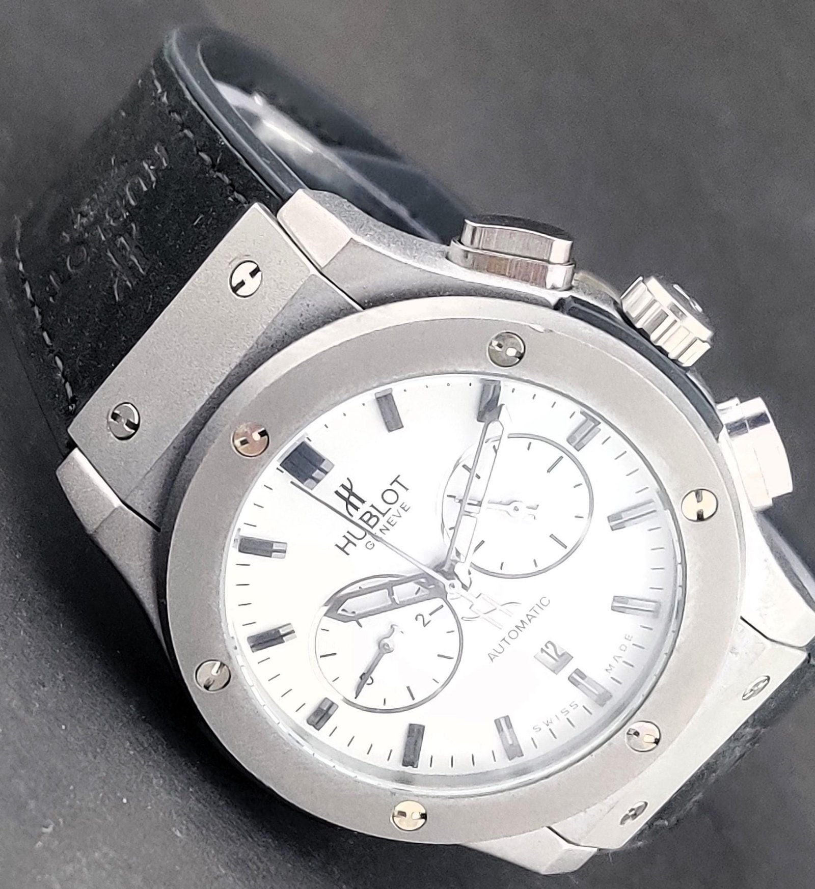 Add a bold luxury look to your collection with this Hublot-style automatic watch, featuring a clean white dial, brushed metal case, and dual sub-dial layout. The watch is pre-owned and professionally refurbished, fully tested, polished, and in excellent working condition.