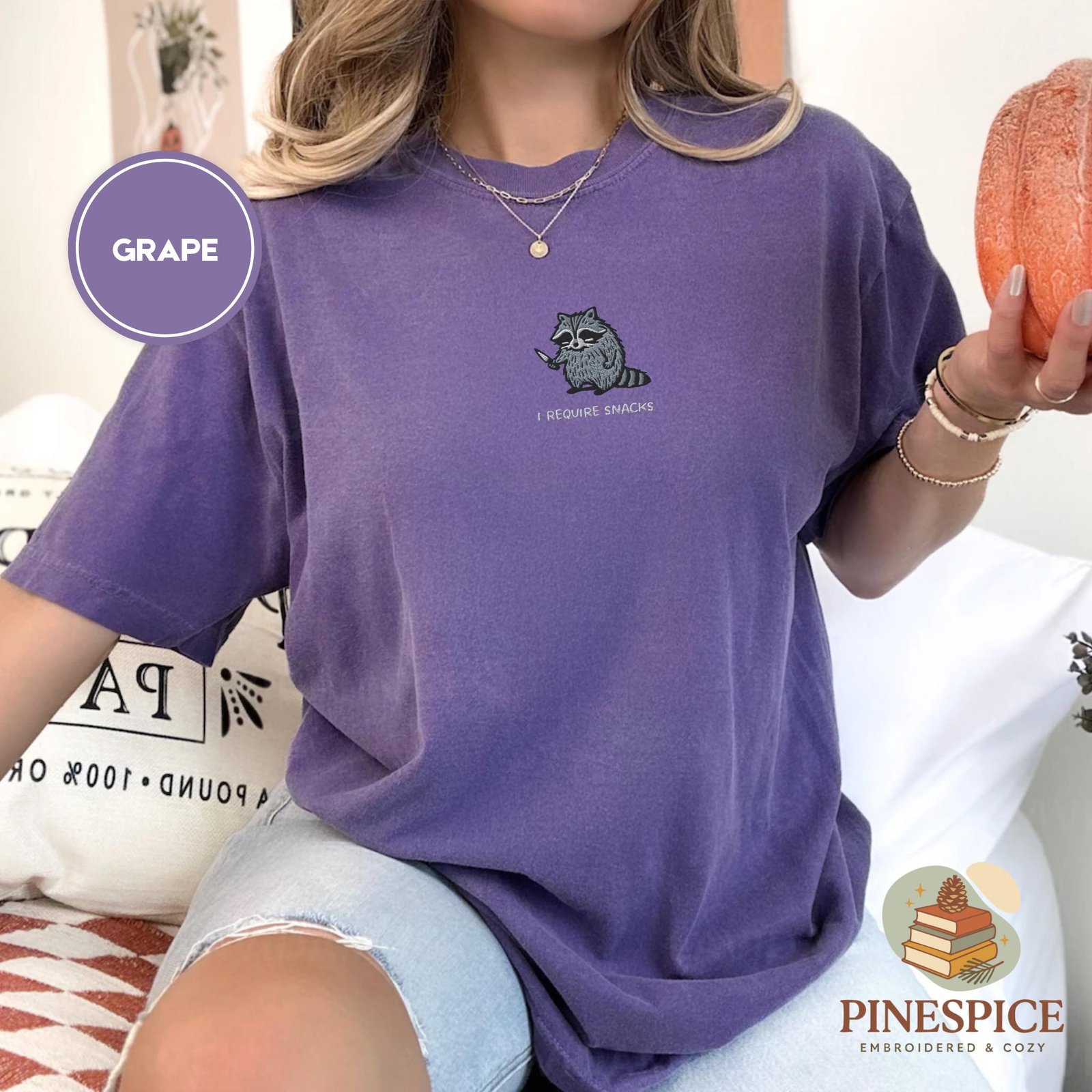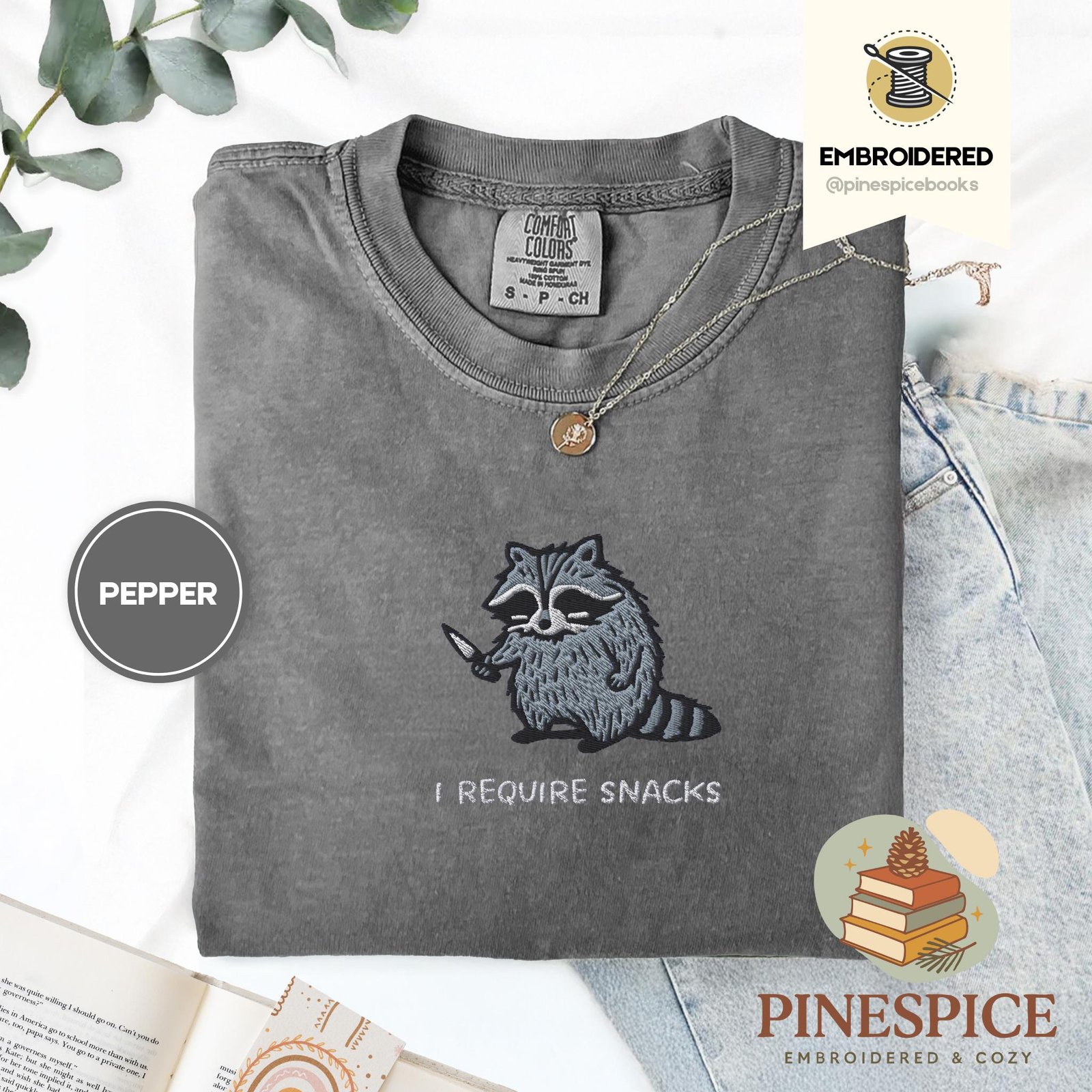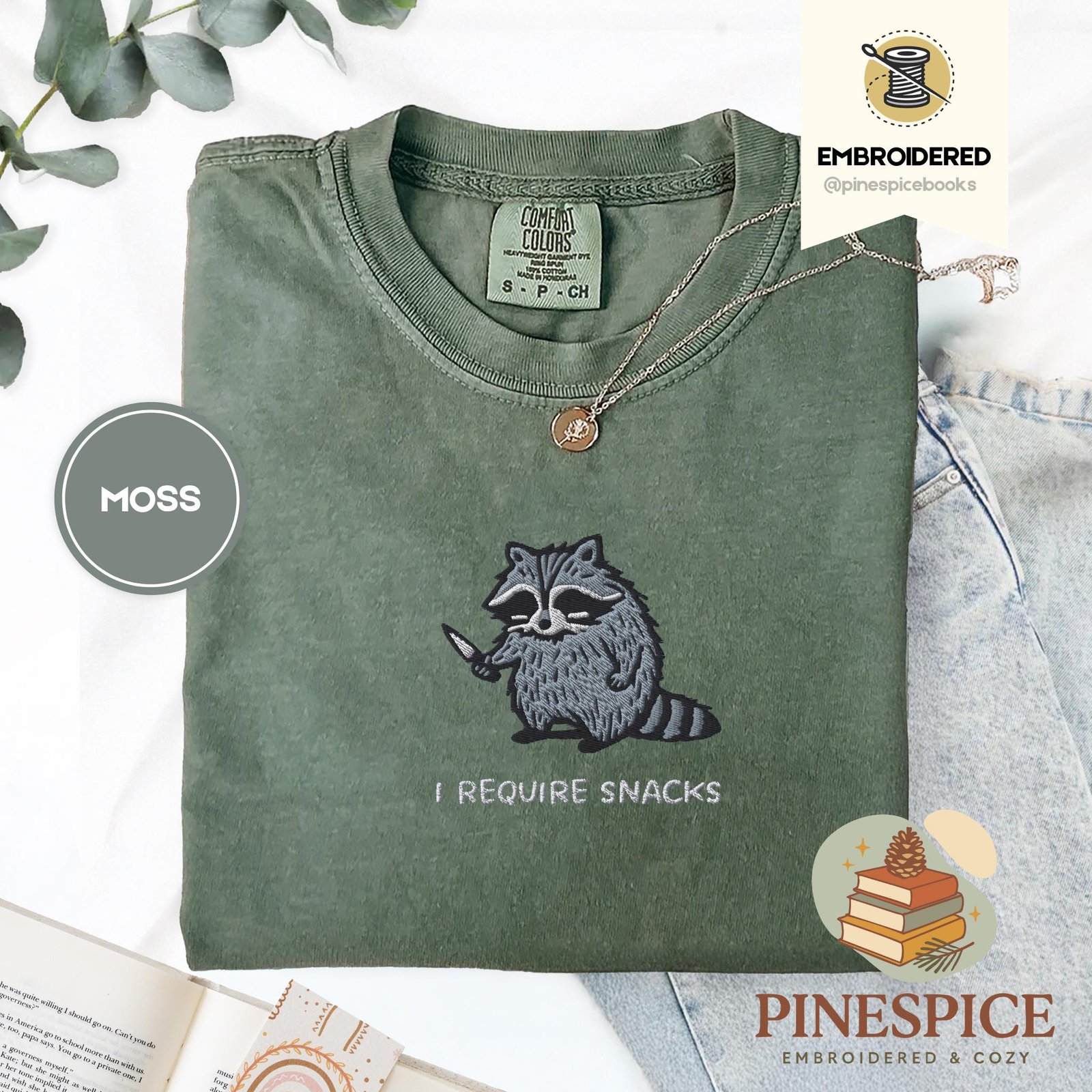 I require snacks tee, embroidered raccoon shirt, funny unhinged t-shirt, comfort colors 1717, feral snack goblin tee, chaotic cute animal
