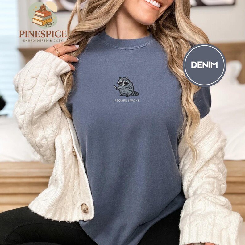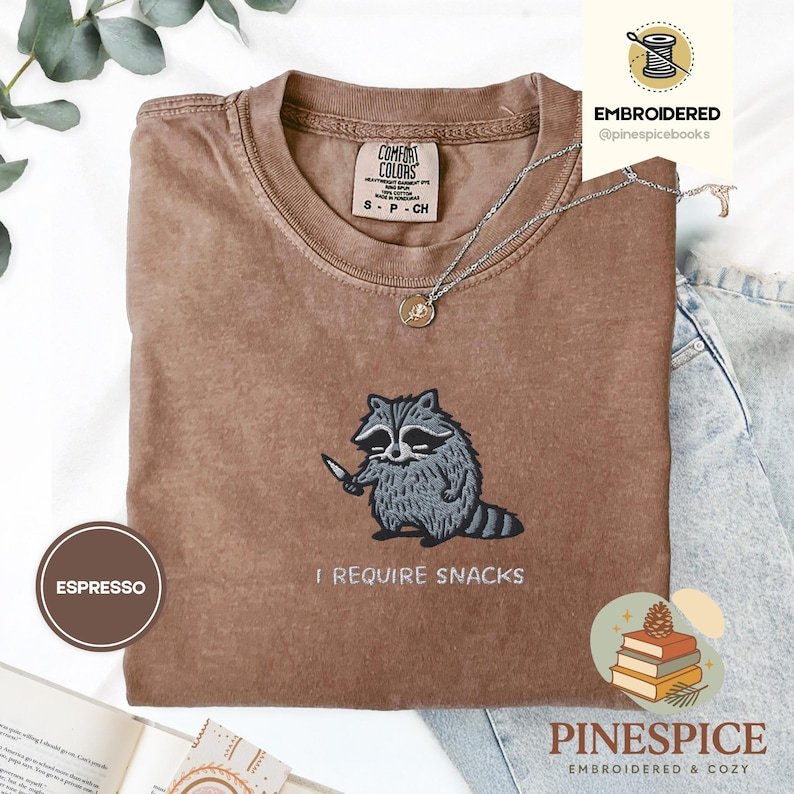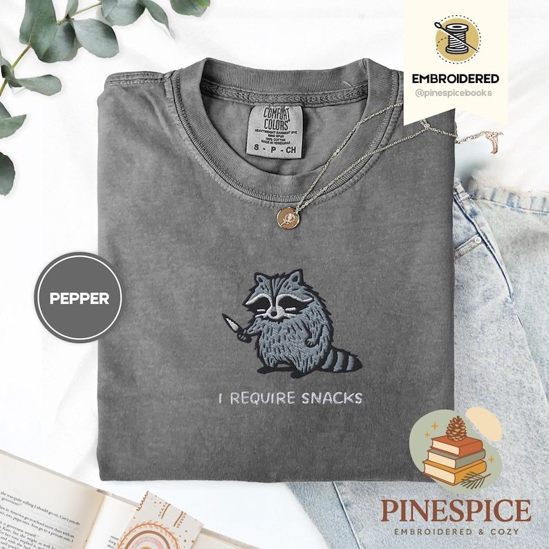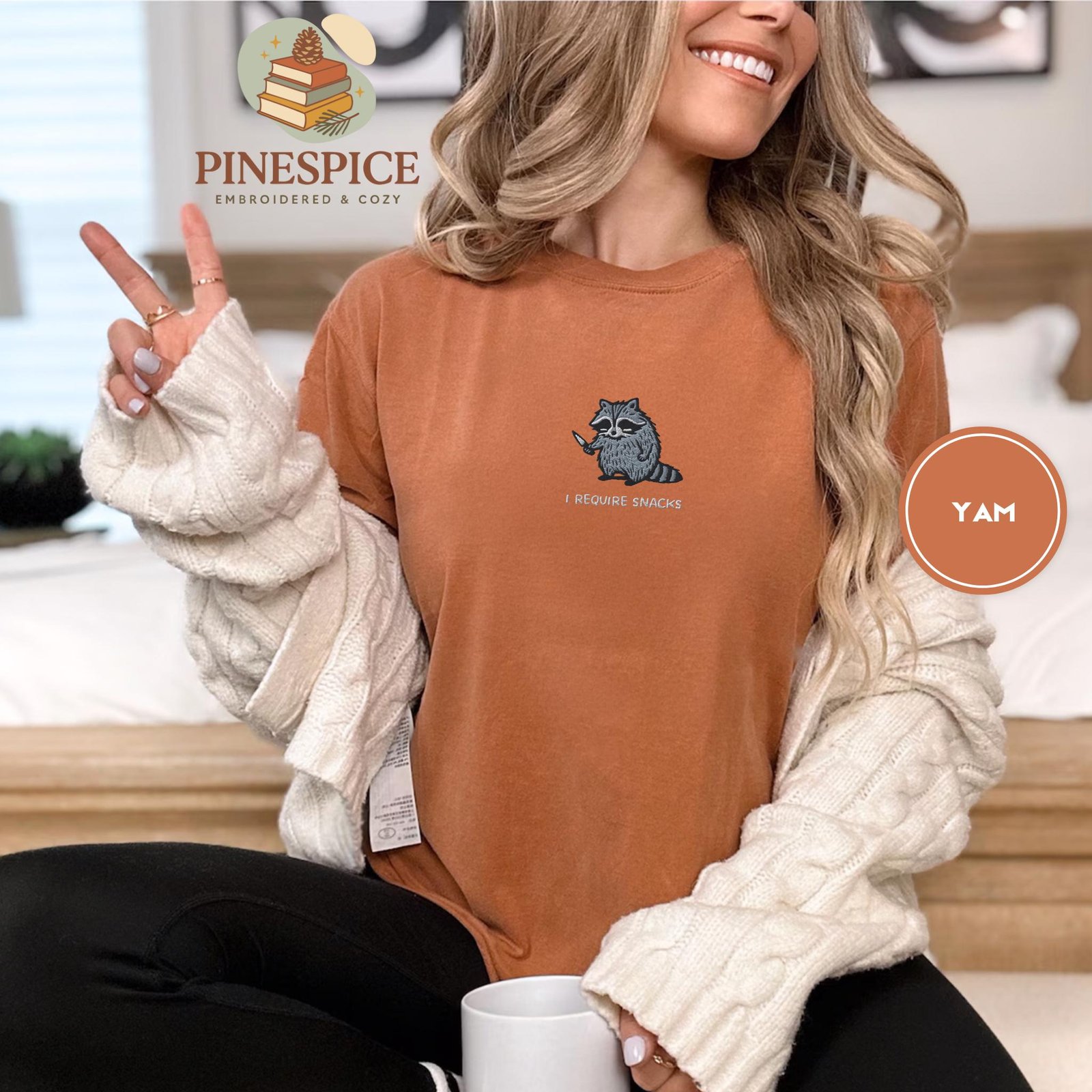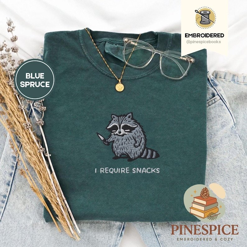 I require snacks tee, embroidered raccoon shirt, funny unhinged t-shirt, comfort colors 1717, feral snack goblin tee, chaotic cute animal