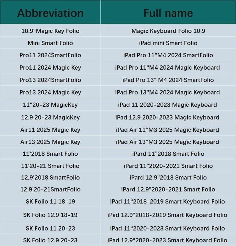 10.9“Magic Key Folio ,Mini Smart Folio ,Pro11 2024SmartFolio ,Pro11 2024 Magic Key ,Pro13 2024SmartFolio ,Pro13 2024 Magic Key ,11"20-23 MagicKey ,12.9 20-23 MagicKey ,Air11 2025 Magic Key |