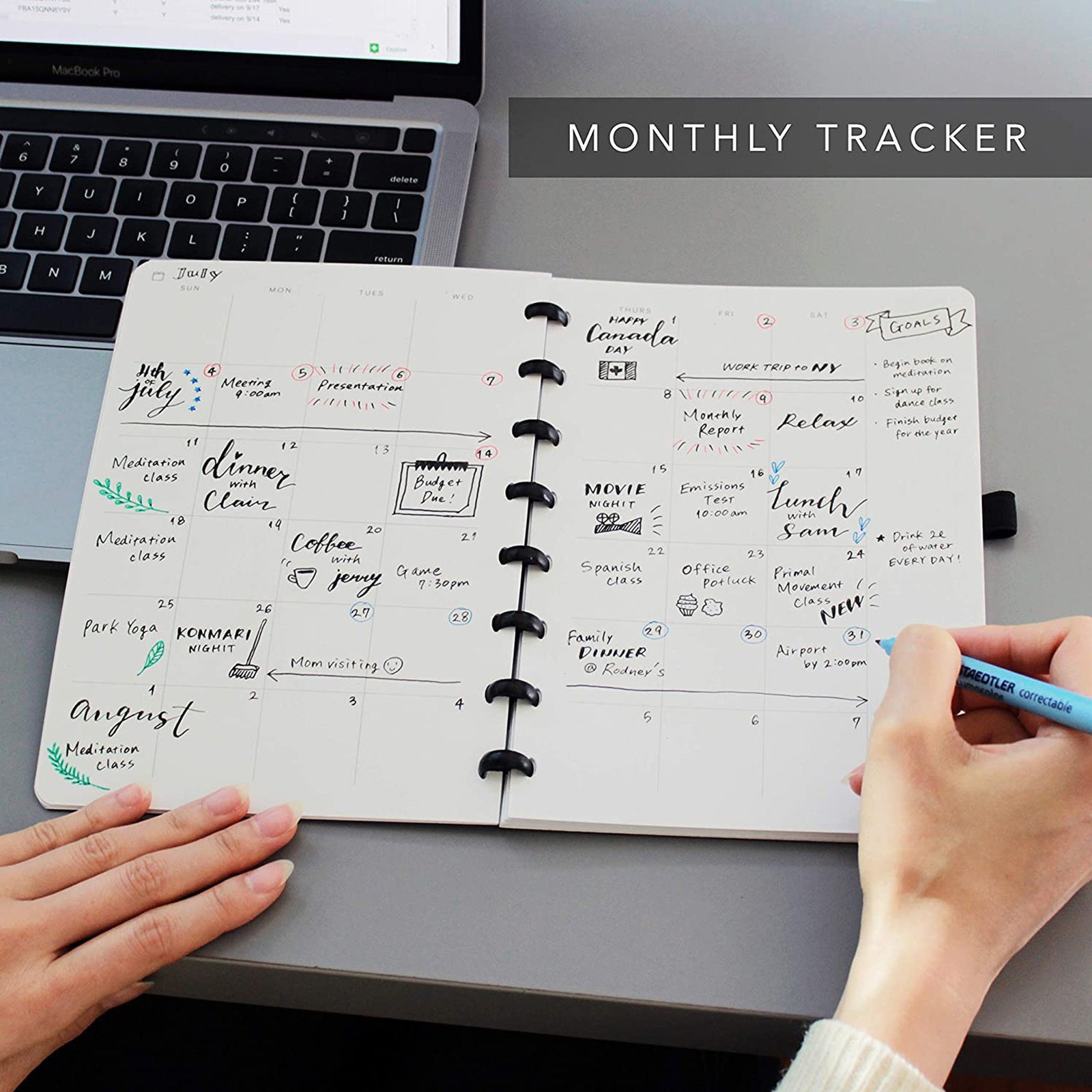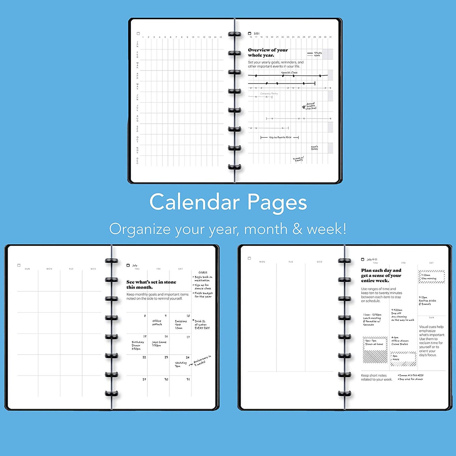 – Stay focused and get a sense of your entire year, month, and week at a glance with open-dated calendars