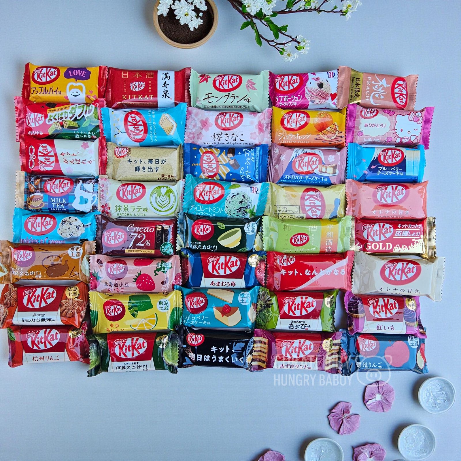 Wheat Biscuit 🌾 • Dark Chocolate 🍫 • Dark Cacao 🍫 • Sakura Red & White 🌸 • Milk Tea 🥛 • Dark Matcha Otona no Amasa 🍵 • Orange 🍊 • Strawberry 🍓 • Raspberry 🍓 • White Chocolate Otona no Amasa • Cookies & Cream 🍪🥛 • Matcha + Original Combo 🍵🌾 • Strawberry Shortcake 🍰 • Matcha Latte 🍵 • Sakura & Roasted Soybean 🌸🌰 • Sanrio Strawberry Milk 💗 • Gold Caramel ✨ • Apple Pie 🍎🥧 • Strawberry Gateau 🎂 • Strawberry & Chocolate 🍓🍫 Milo and KitKat Collab