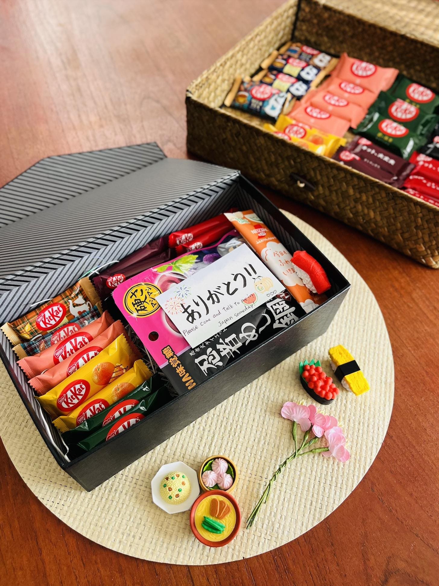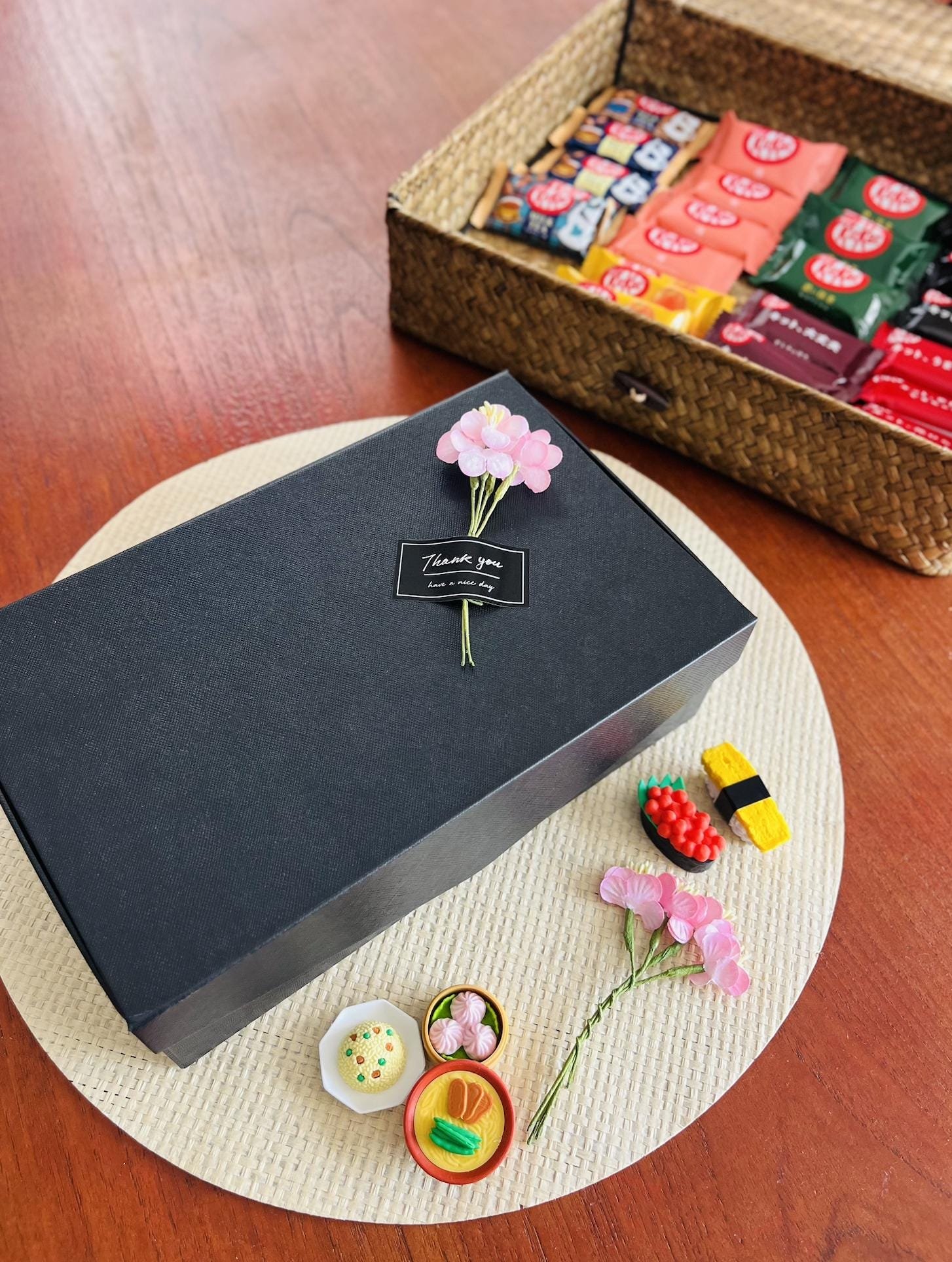 A stylish black gift box is filled with individually sealed items to maintain freshness.