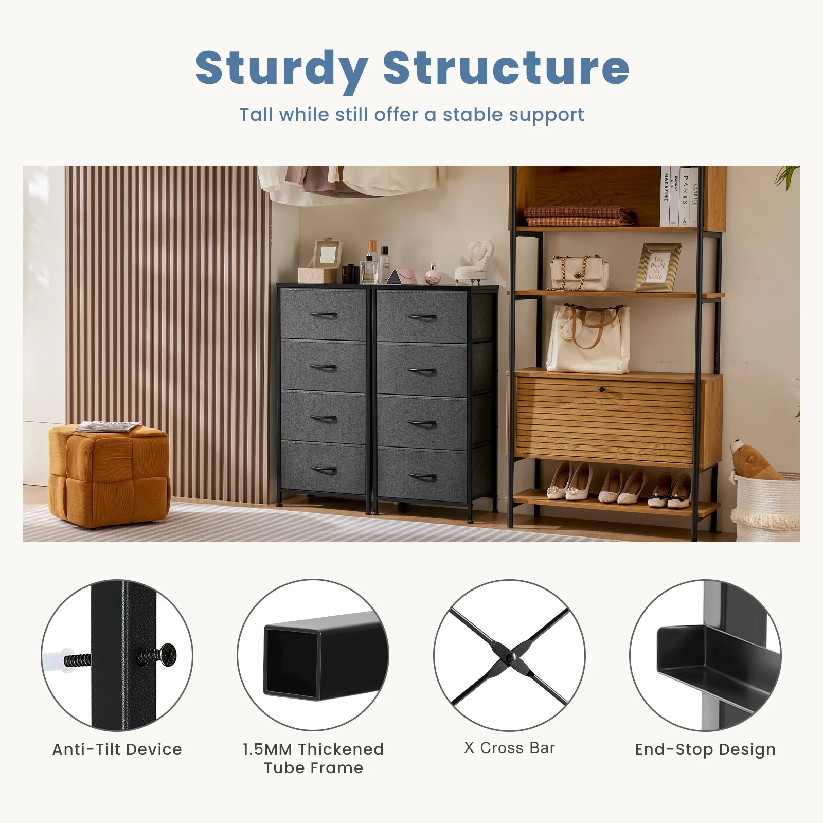JHK Dresser For Bedroom With 4 Fabric Drawers Nightstand Wardrobe Steel Frame Closet For Clothes Storage Cabinet Of Furniture