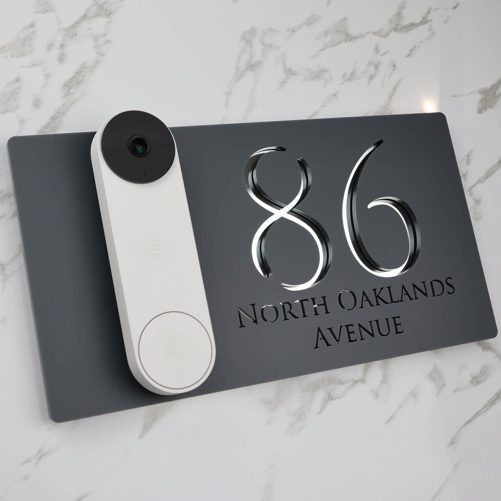 K Smart Sign | Bellissima DB | Ring Nest Video door-bell Laser Cut Matt Dark Gray Anthracite & Silver Mirror Floating House Sign