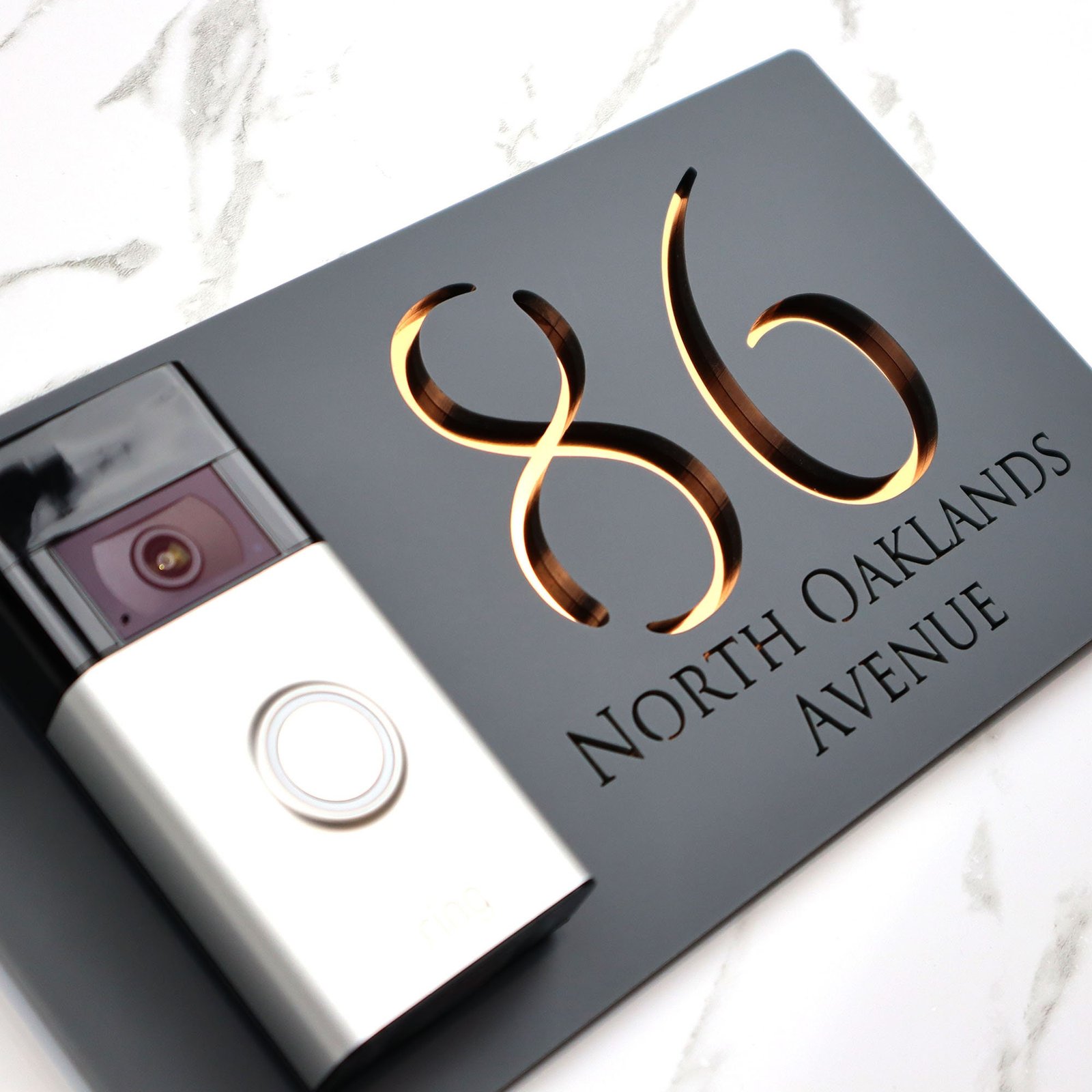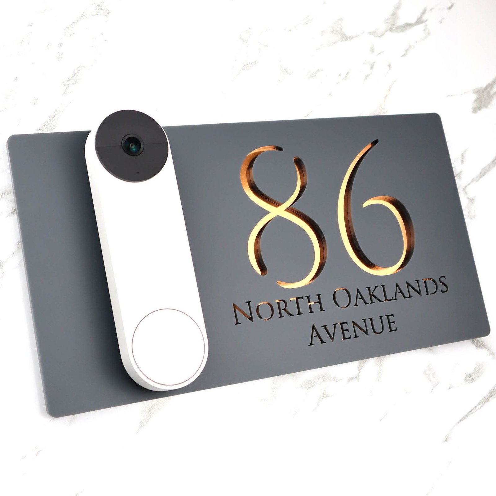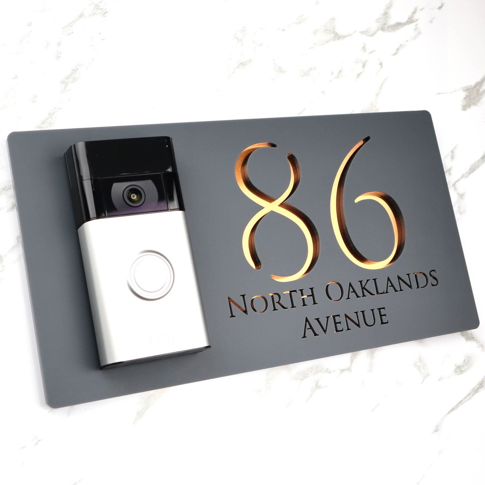K Smart Sign | Bellissima DB | Ring Nest Video doorbell Laser Cut Matt Dark Gray RAL7016 Anthracite & Copper Mirror Floating House Sign