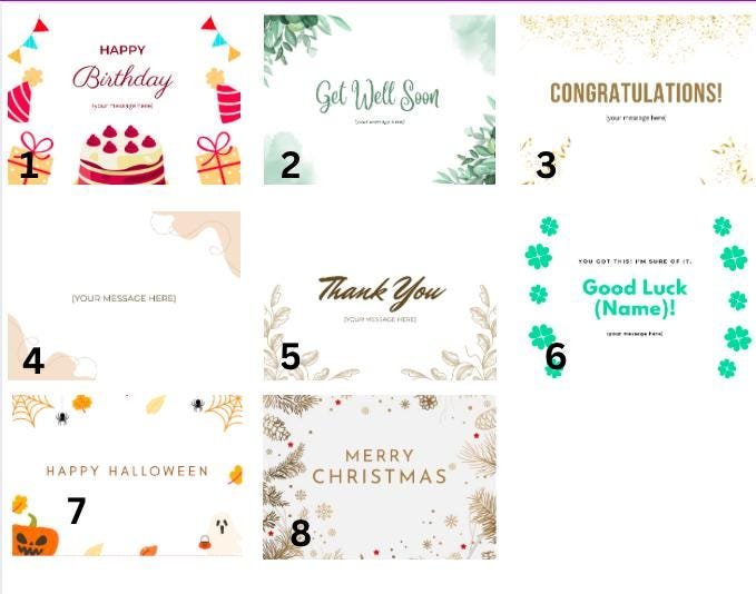 1. Happy Birthday ,2. Get Well Soon ,3. Congratulations ,4. Neutral ,5. Thank You ,6. Good Luck ,7. Halloween ,8. Christmas |