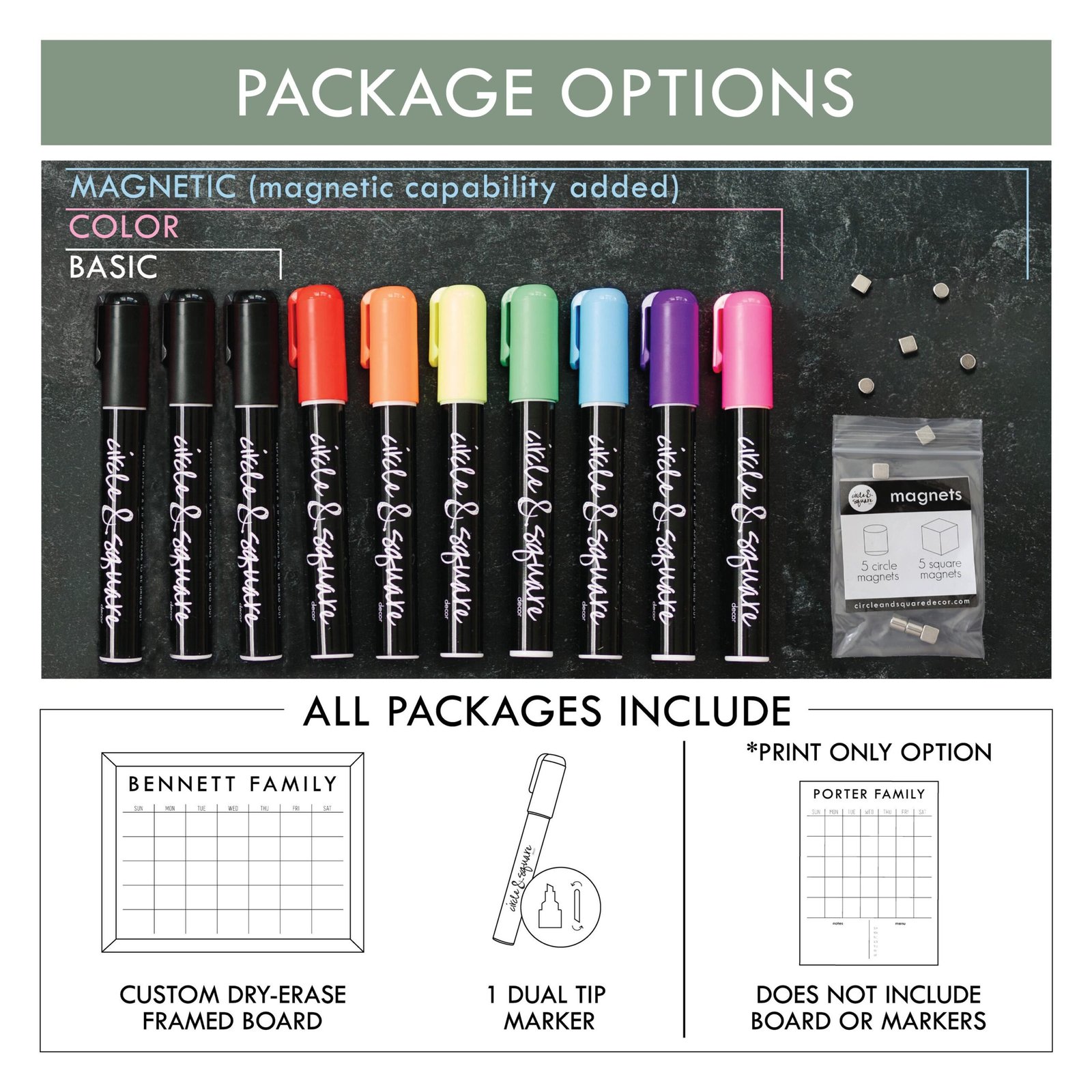 𝐌𝐚𝐠𝐧𝐞𝐭𝐢𝐜 𝐂𝐨𝐥𝐨𝐫 𝐏𝐤𝐠: ten ¼” small magnets, 7 colored reversible-tip markers, 1 black marker,, your personalized design framed in your color choice with a non-glare dry/wet-erase front. Comes ready to hang and use!