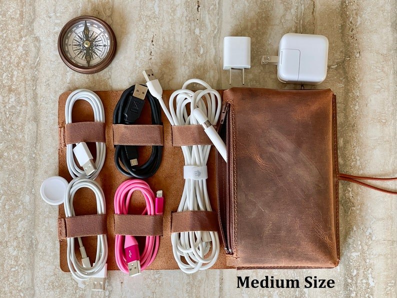 Leather Cable and Charger Organizer Bag, Handmade Cord organizer, Travel charger roll, Storage, Cord Roll, Travel case, Groomsmen Gift