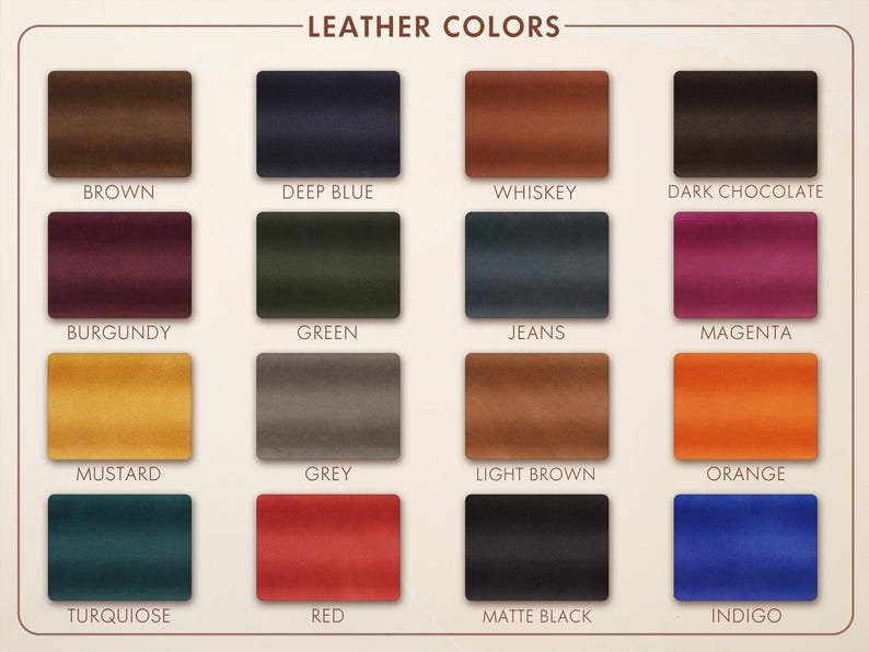 Matte Black ,Dark Chocolate ,Grey ,Brown ,Whiskey ,Mustard ,Light Brown ,Deep Blue ,Jeans ,Green ,Turquoise ,Burgundy ,Red ,Orange ,Magenta ,Indigo |
