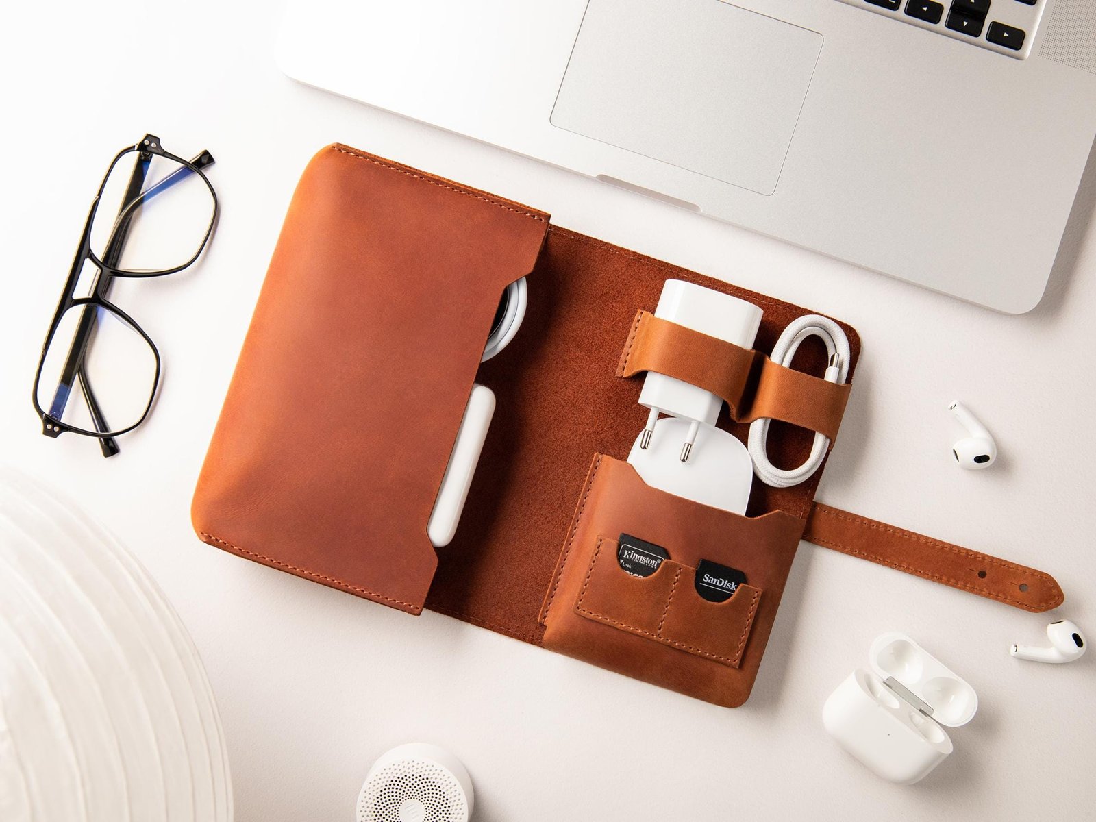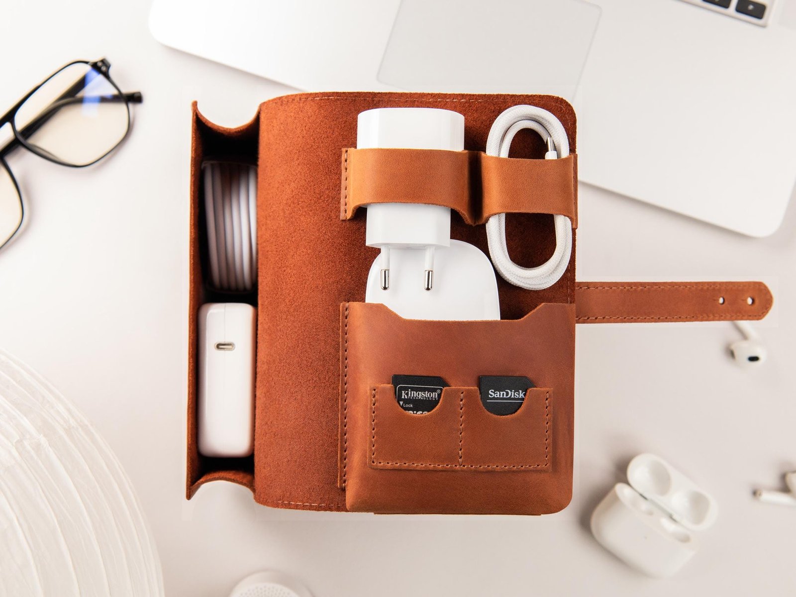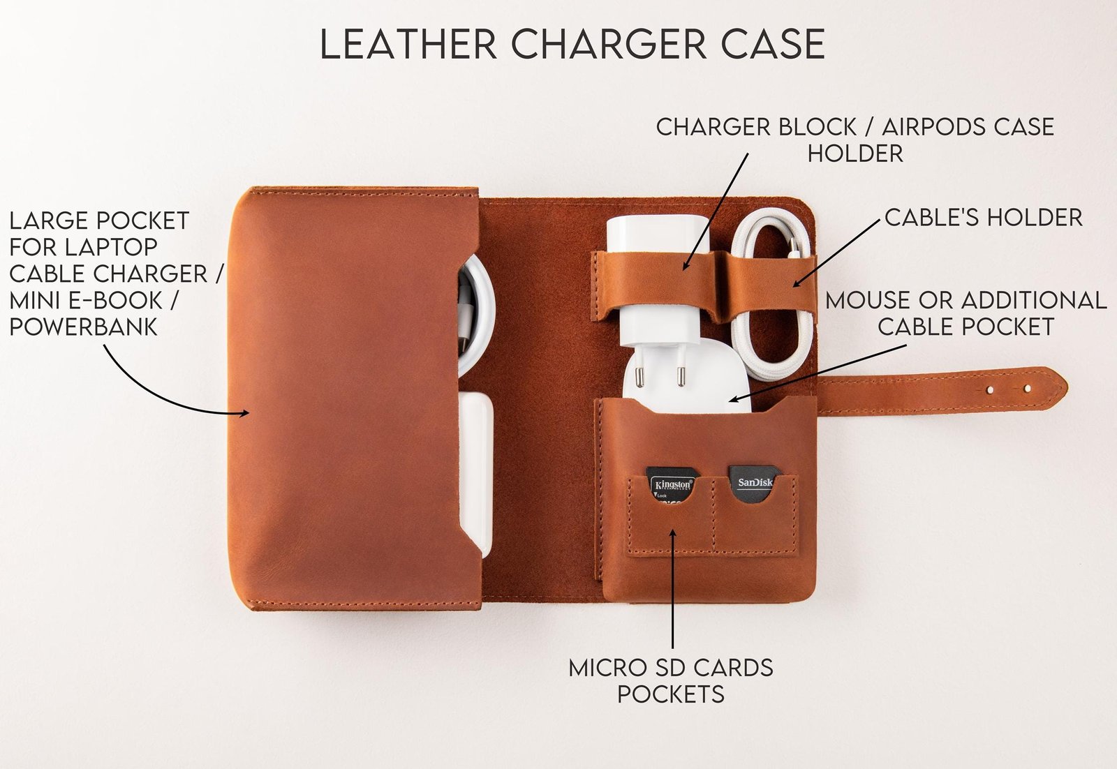 Leather Charger Case, Personalized Cable Organizer, Leather Charger Holder, Travel Electronics Bag, Genuine Leather Cables Holder