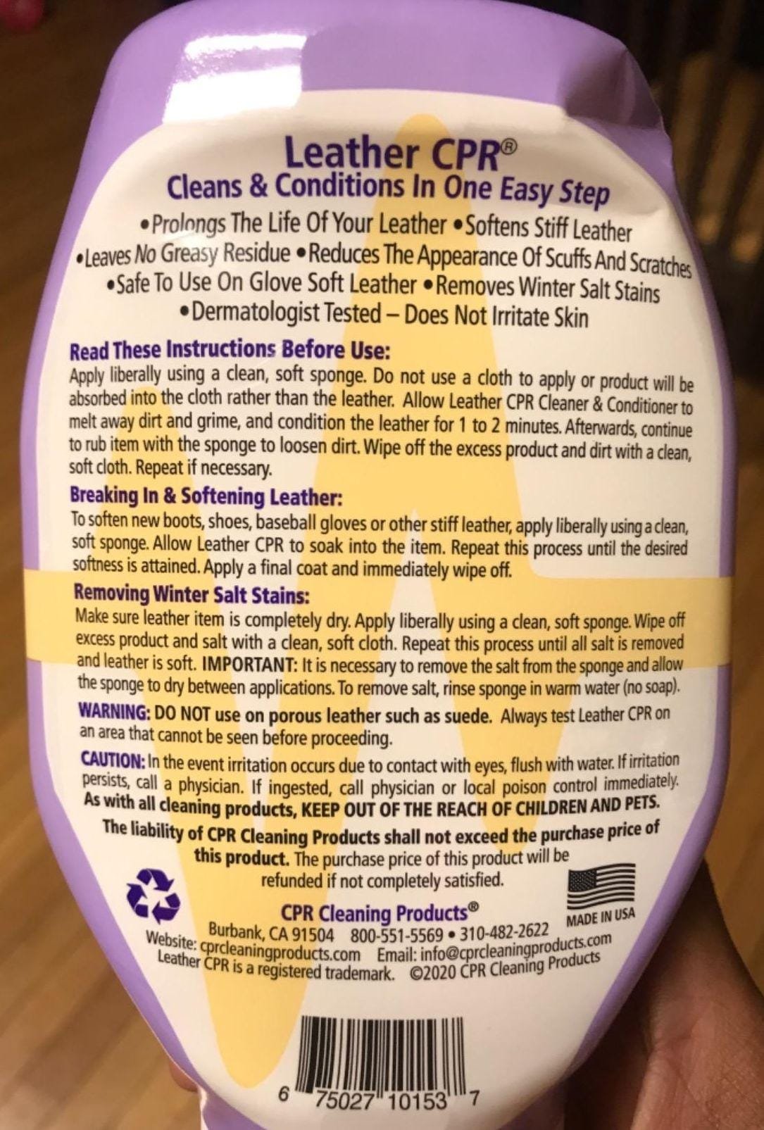 Leather CPR Cleaner & Conditioner, Cleans, Conditions, Restores and Protects Leather Furniture, Handbags, Car Seats, Interior, Purses, Shoes, more