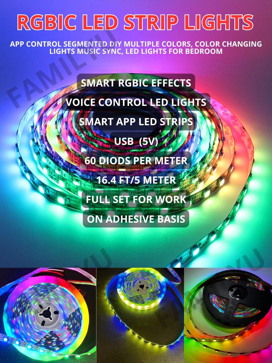 Led Strip Lights 196 inch 5 meter, RGBic, USB, 60 diodes pm, rgbic, bluetooth control Led Light Strip for Bedroom, Home Decoration