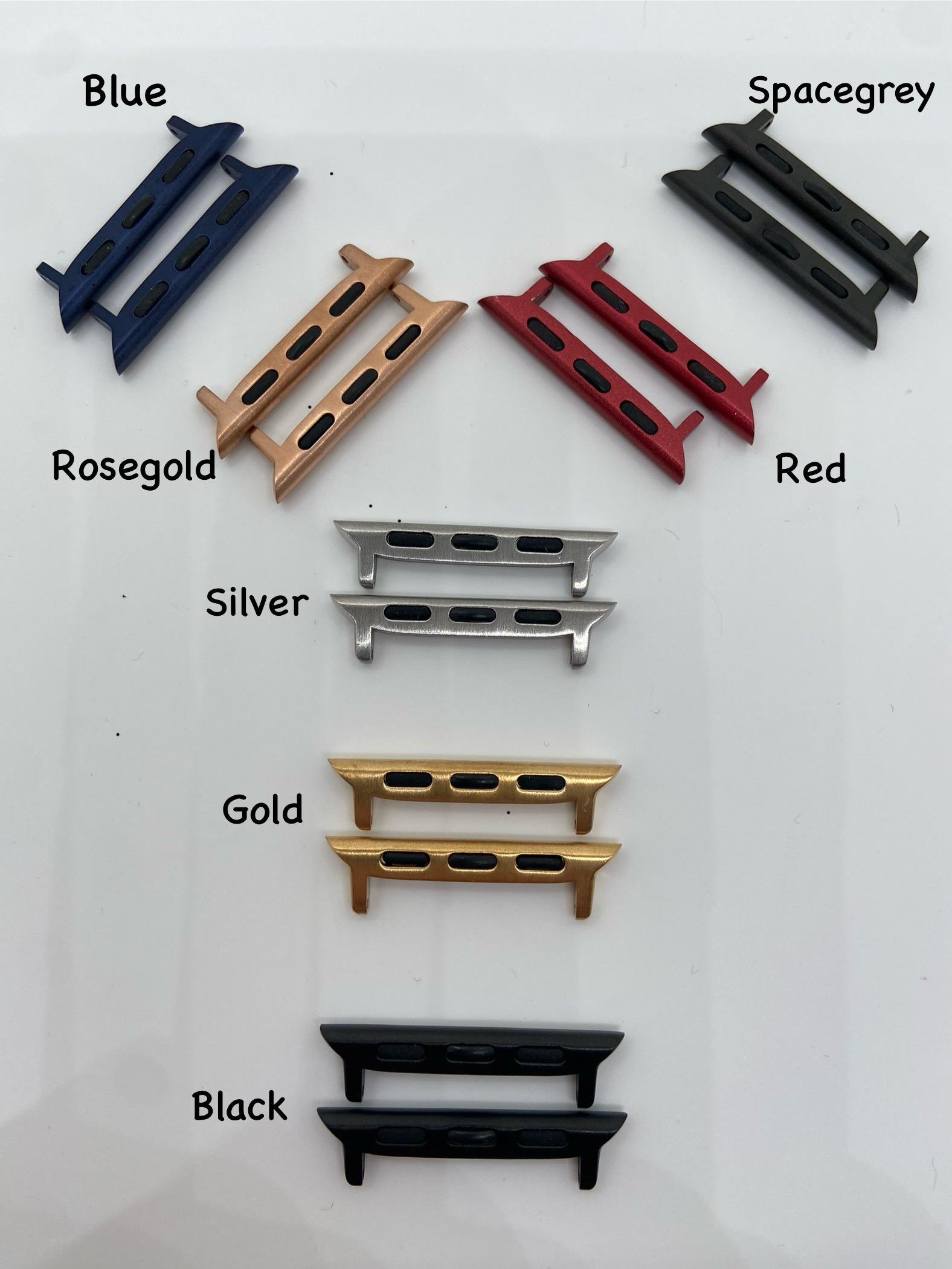 It comes with 8 different clasps and connector colours that match your Apple Watch Silver, Black, Rose Gold, Gold, Red, Blue, Space Grey, Starlight