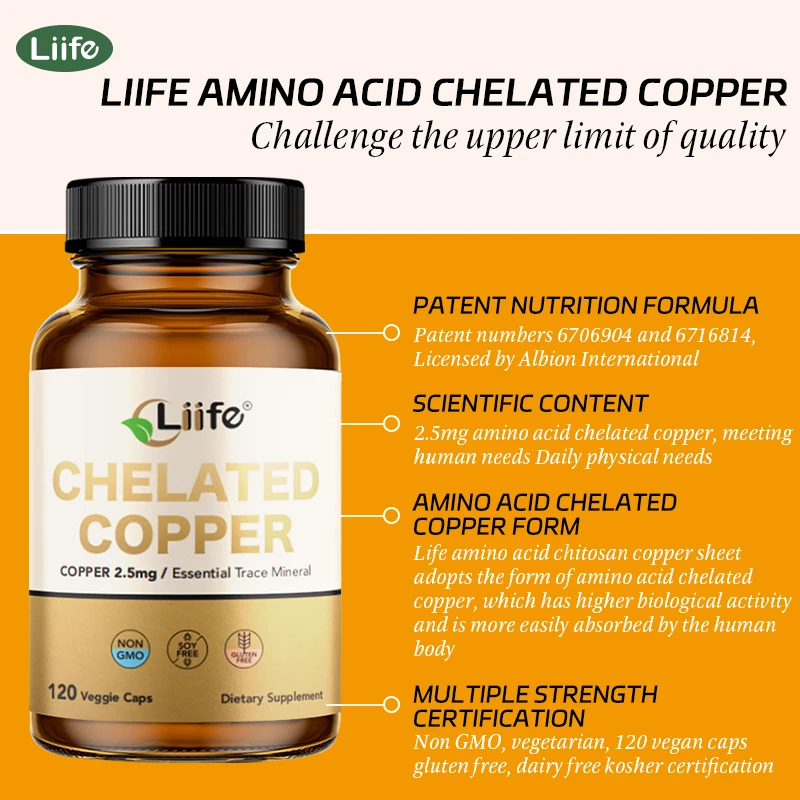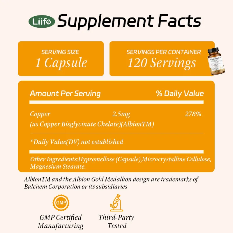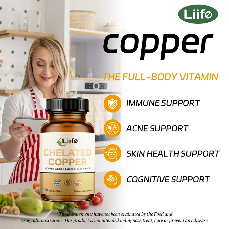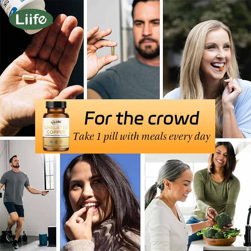 Liife Chelated Copper Supplement–Essential Trace Mineral For Bone,Skin,Nutrient Absorption,120 Capsules,120-Day Supply,Made In