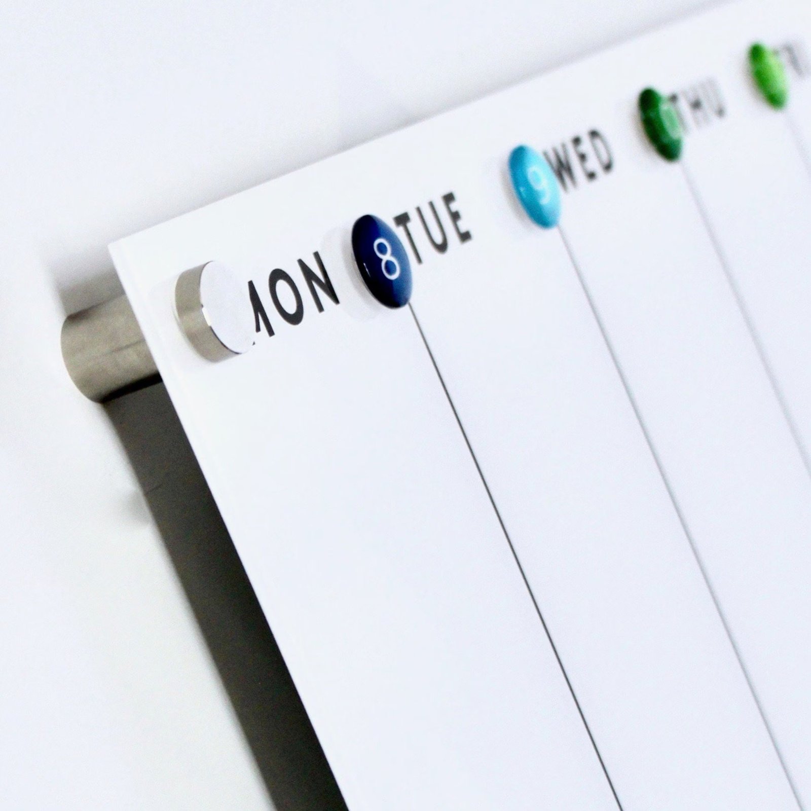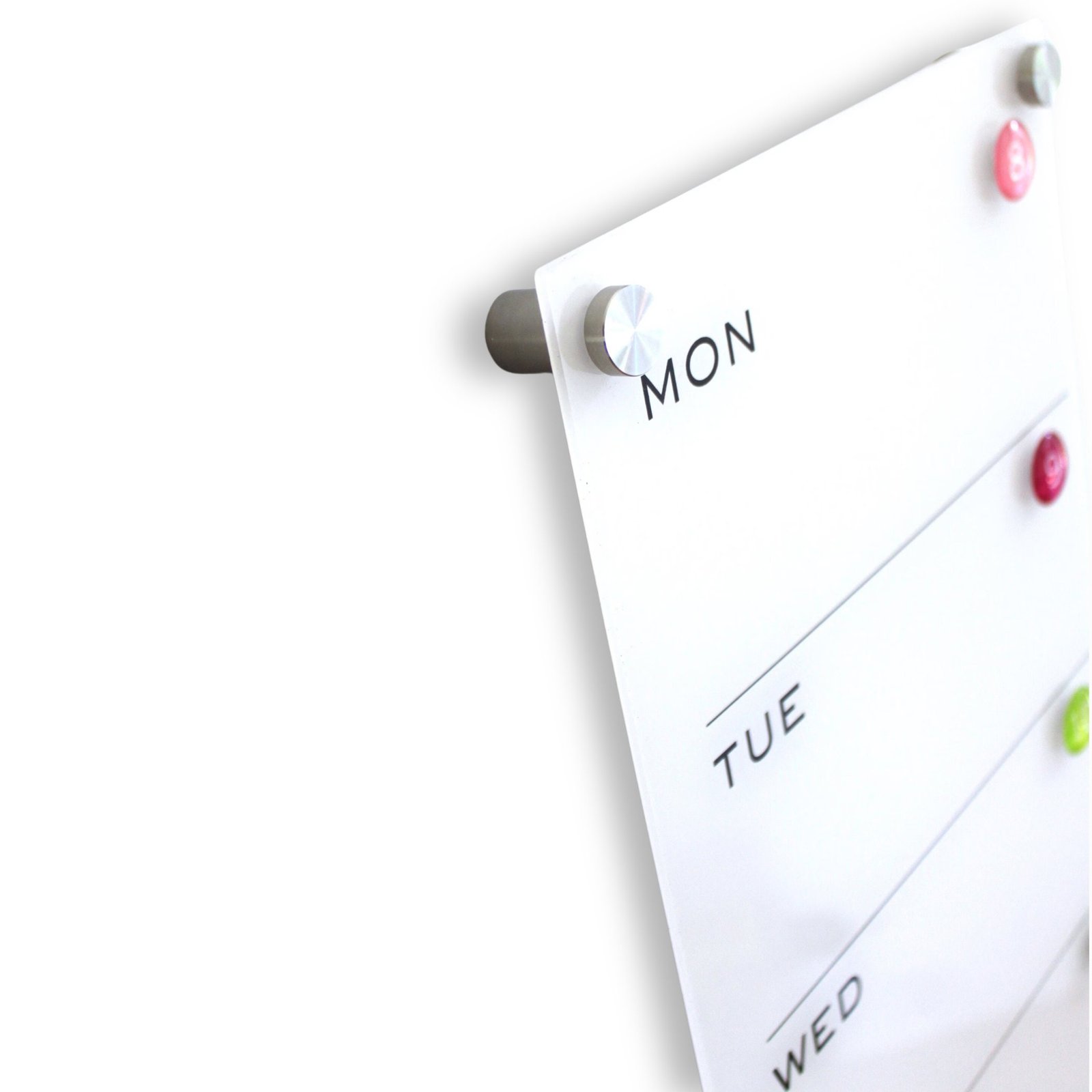 Each calendar comes complete with your selection of 4 elegant standoff hardware options: silver, gold, black or white, providing both stability and a touch of modern sophistication. The surface is fully magnetic, accommodating strong magnets to keep notes and papers secure. We recommend using EXPO brand black wet-erase markers for precision and clarity in your planning.