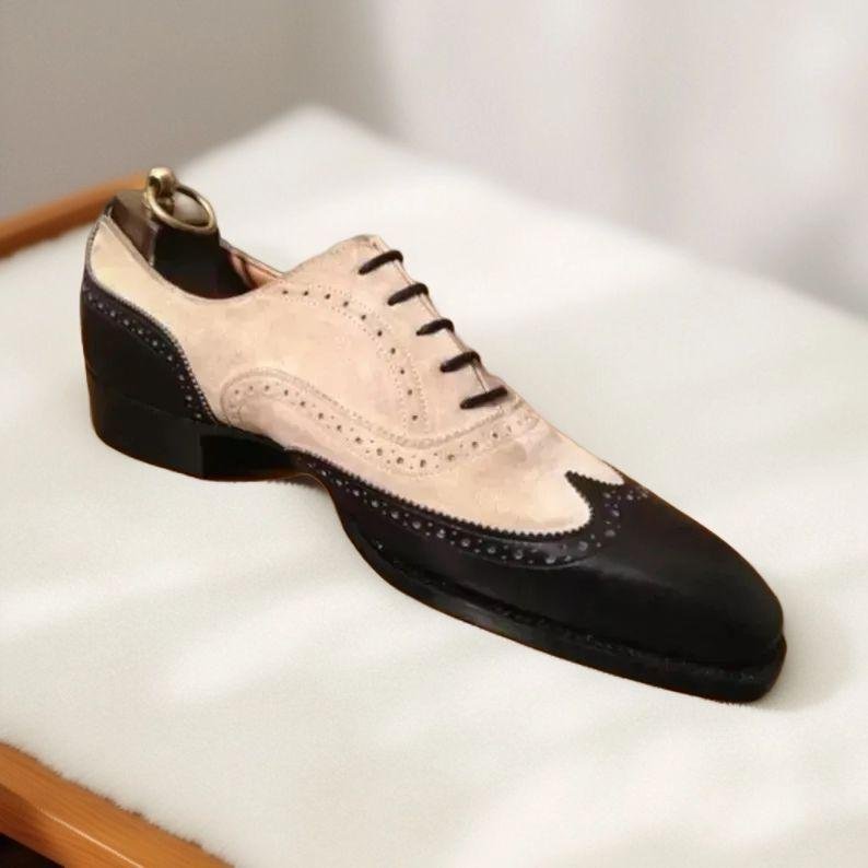 Men's Handmade Two Tone Leather Beige Suede Wingtip Lace up brogue Dress Shoes