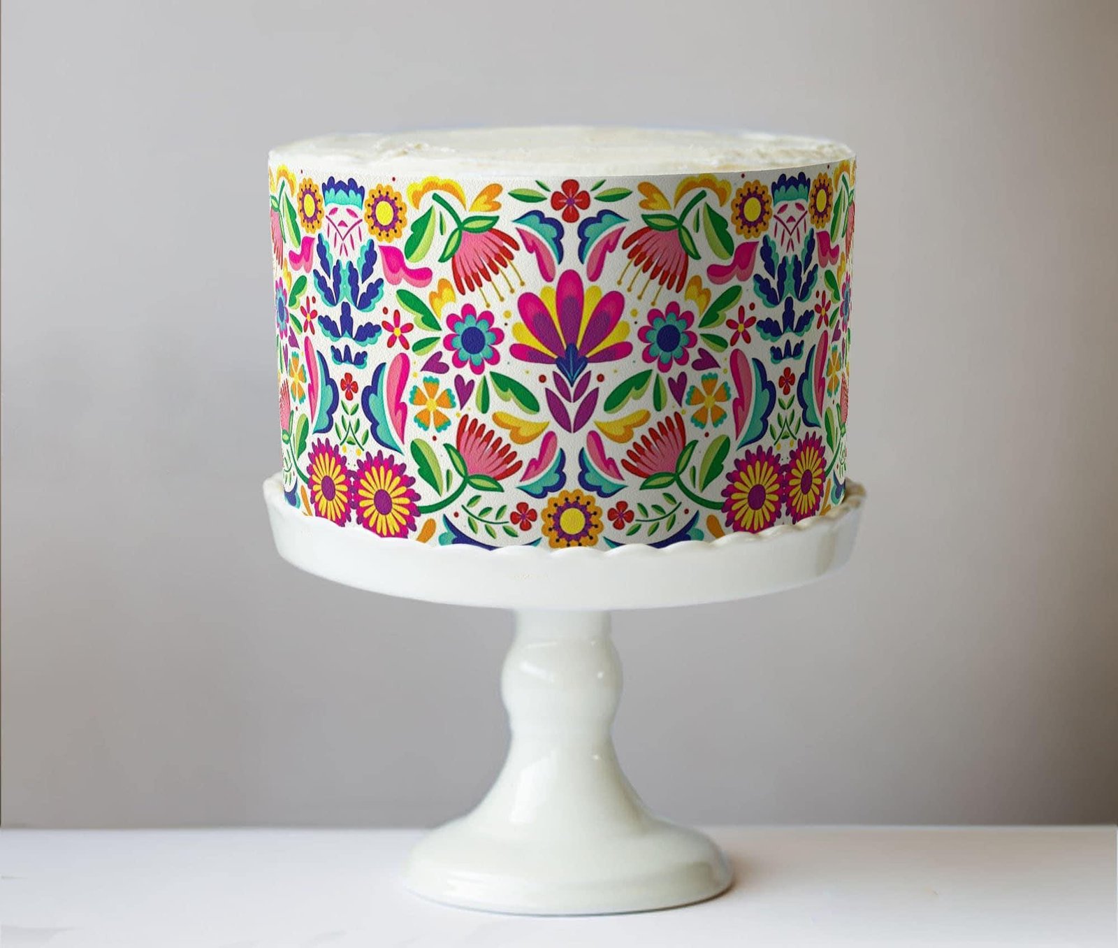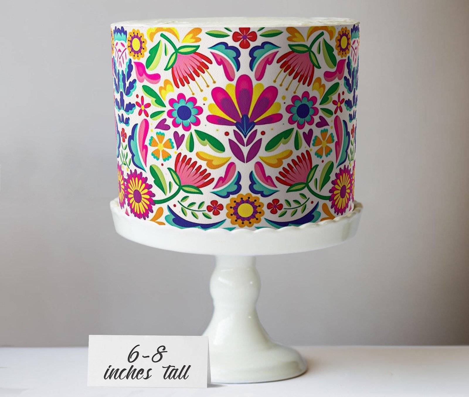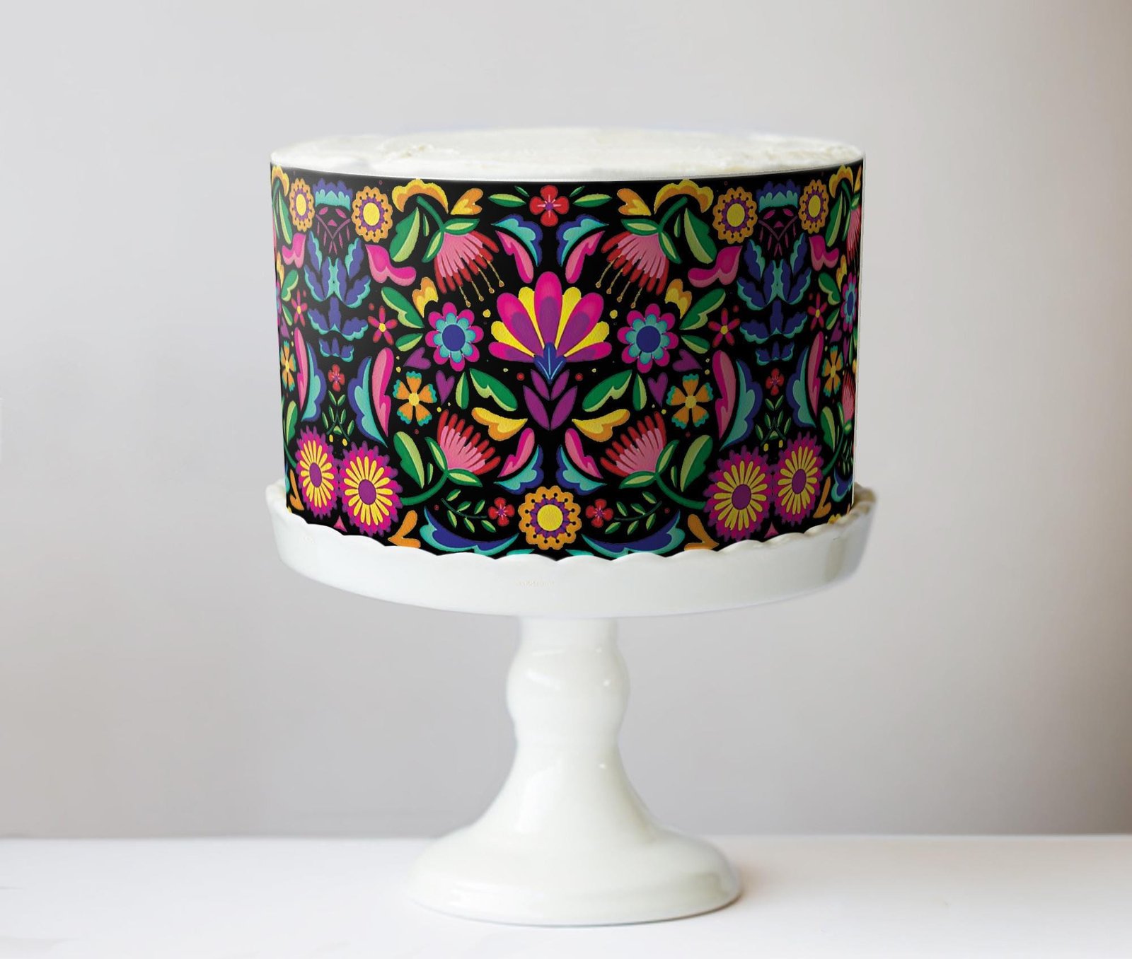 Mexican Embroidery Cake Wrap Mexican Folk Art Edible Image Magical Flower Cake Decor Quinceañera Pattern Icing Vibrant Fiesta Boho Party