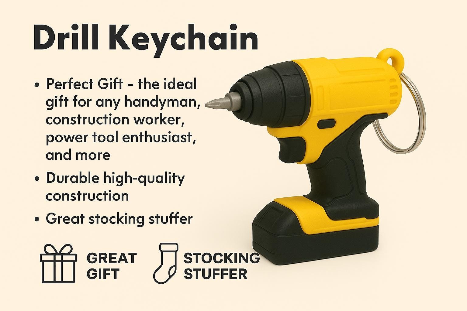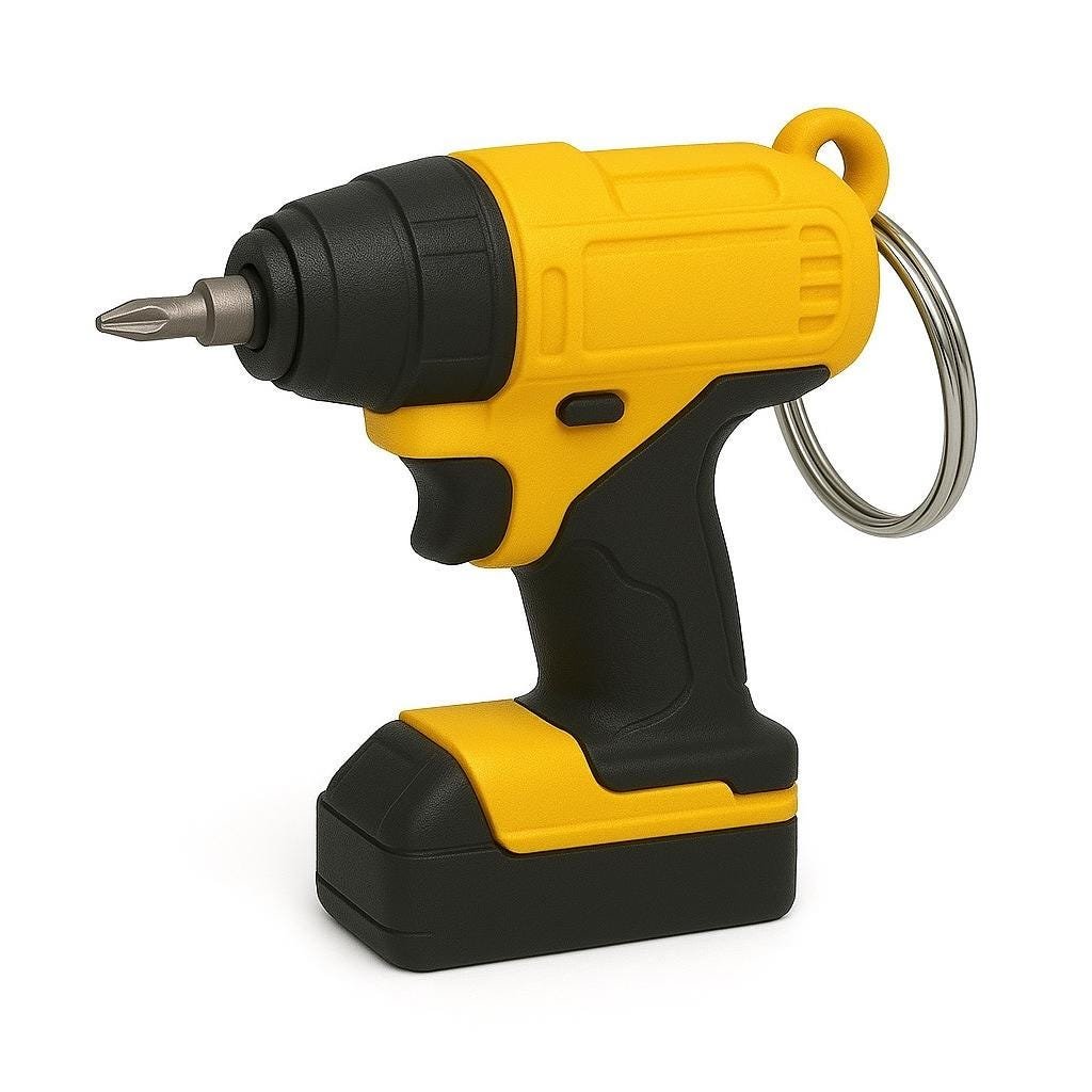 Mini Drill Keychain – Yellow & Black 3D Printed Tool Gift – Fits 14” Hex Bits – Perect Gift Mechanics Contractor | Garage Shop Keychain