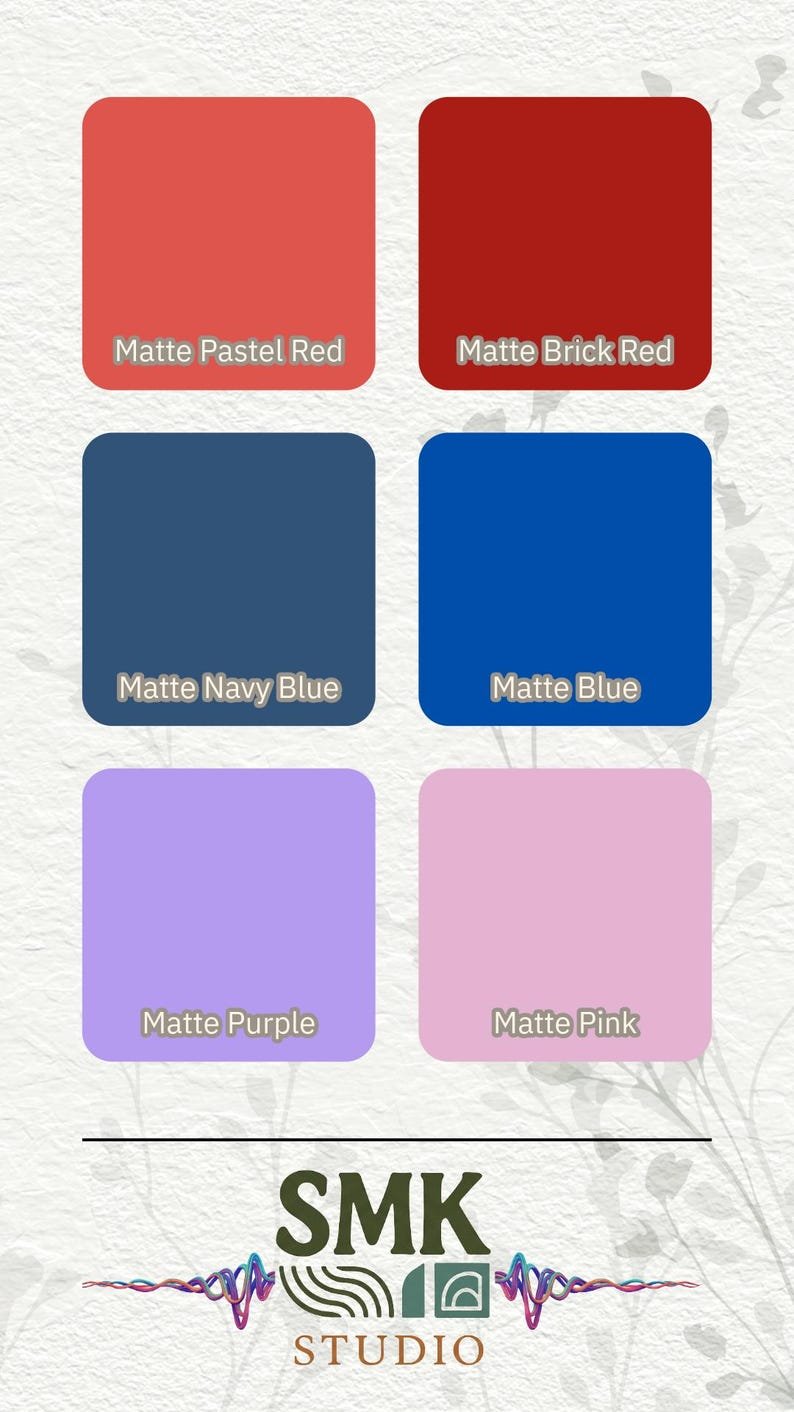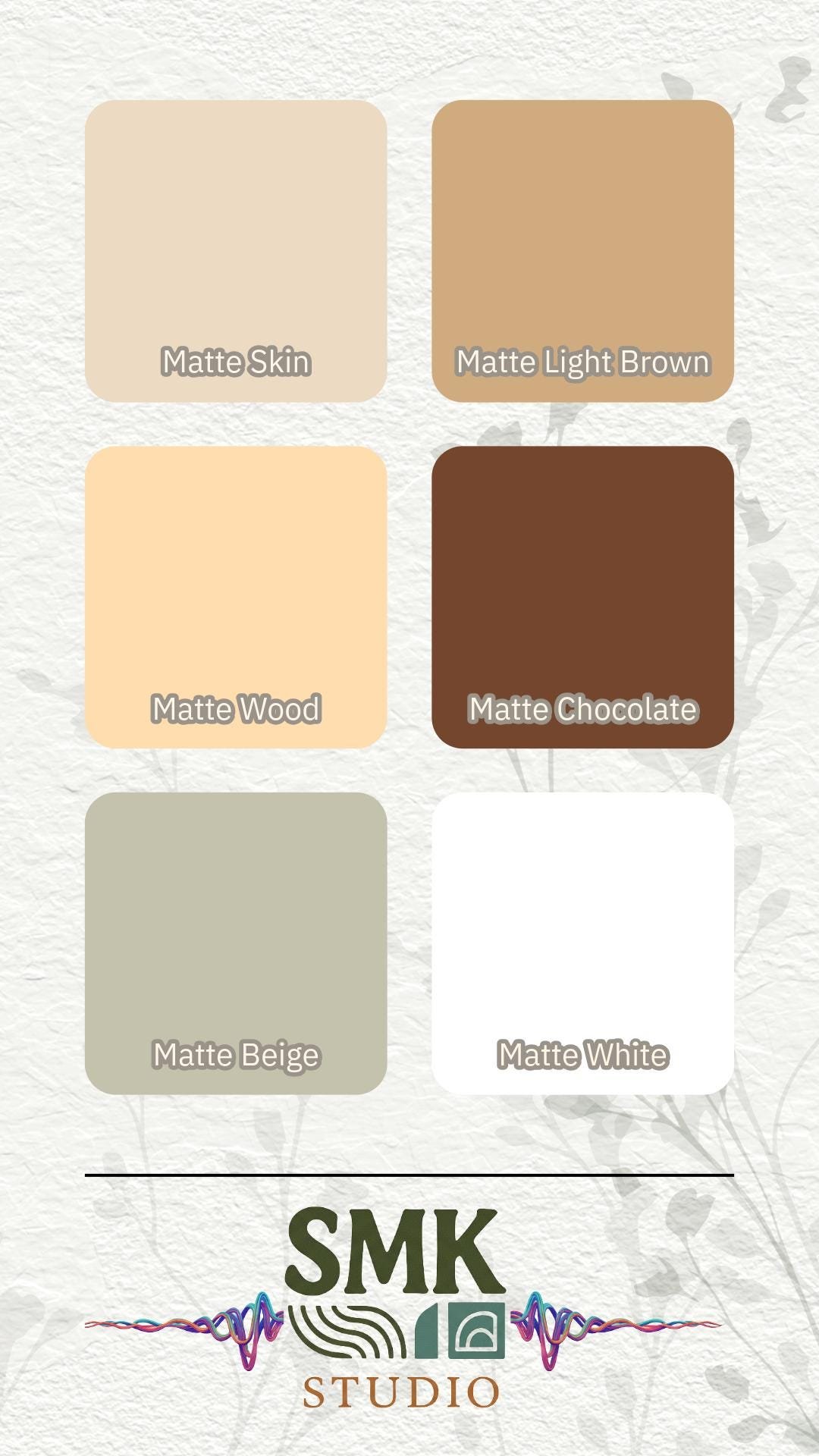 Matte Skin ,Matte Light Brown ,Matte White ,Matte Wood ,Matte Blue ,Matte Brick Red ,Matte Purple |