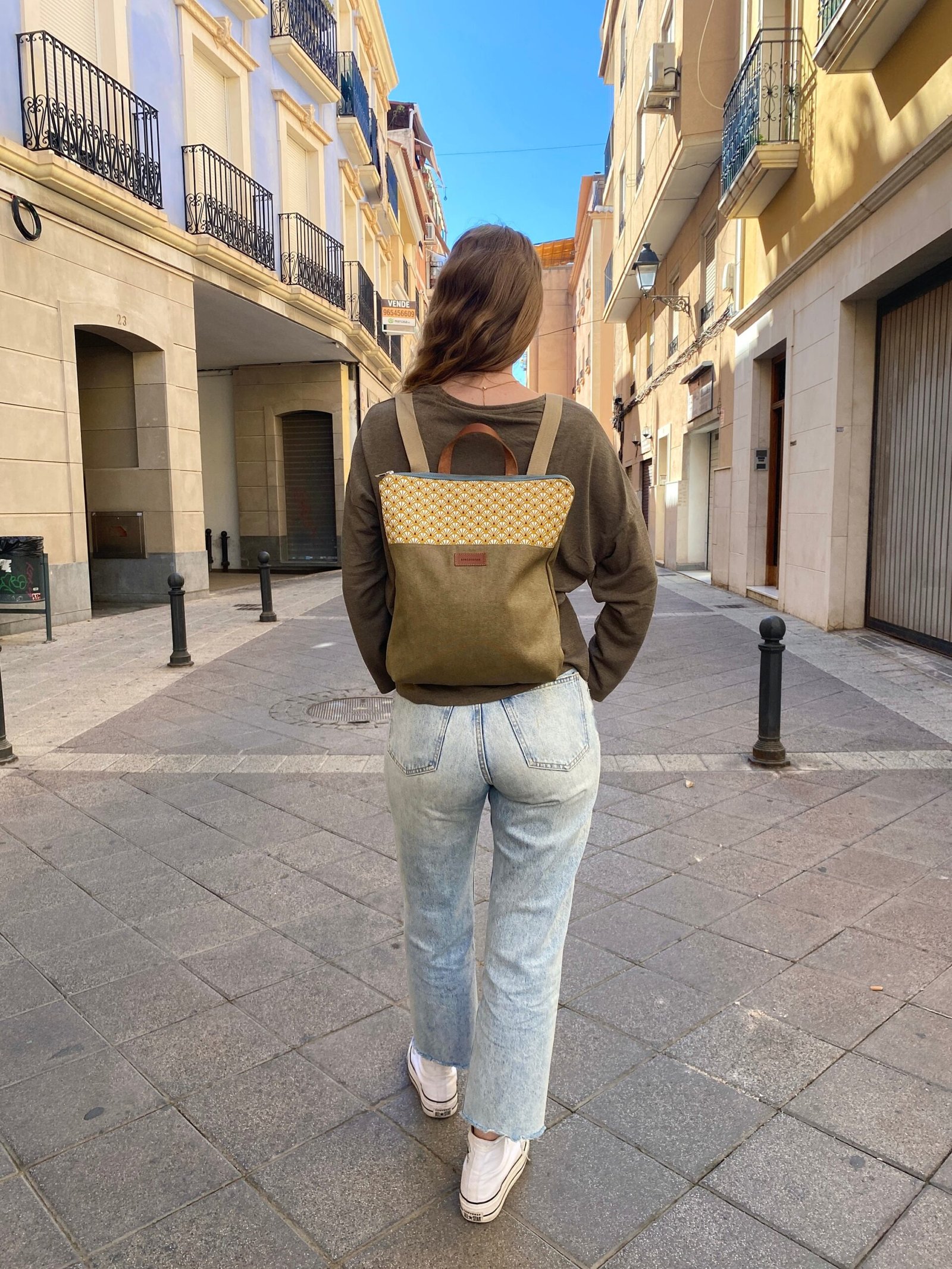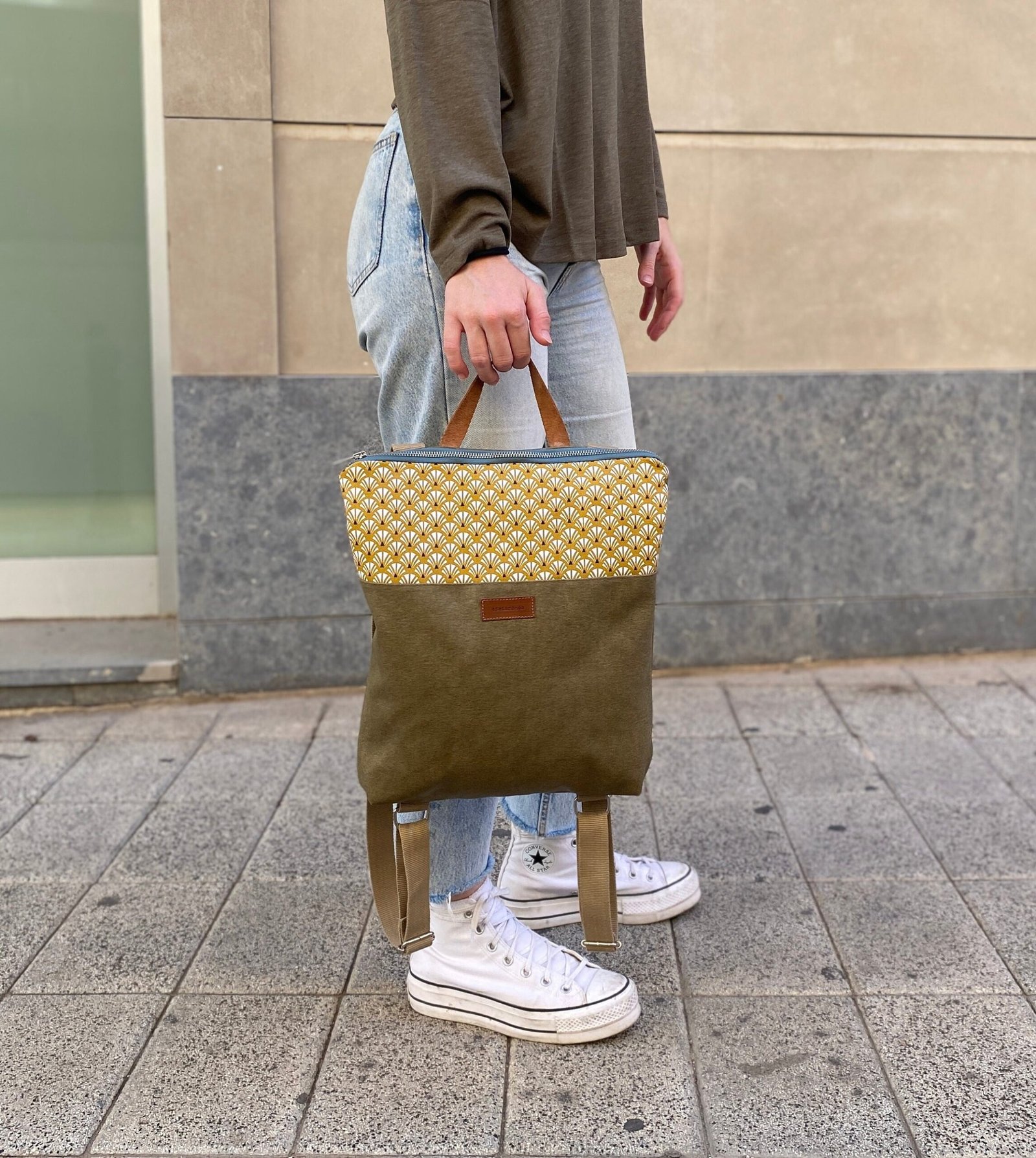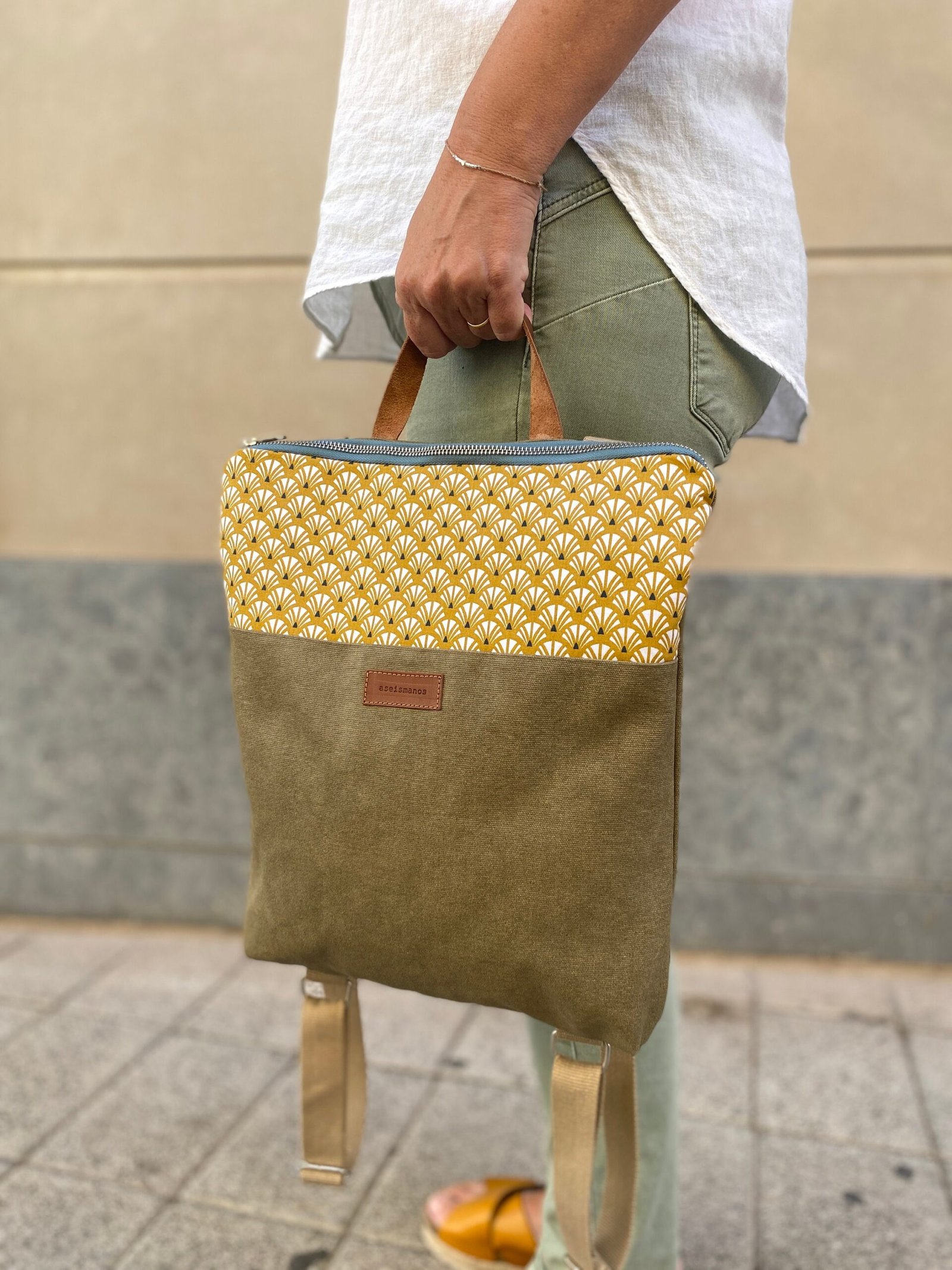 Mochila estampada mostaza, ligera, perfecta para el día a día y con asa de piel