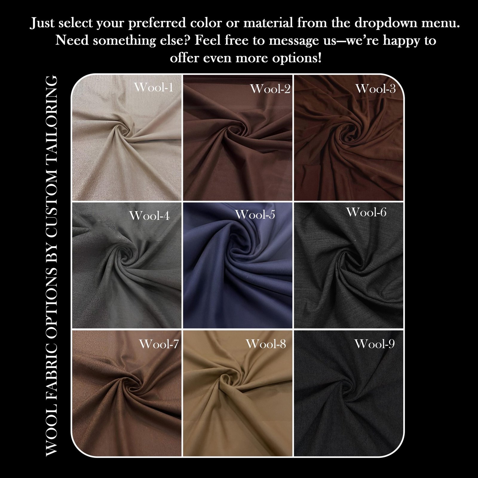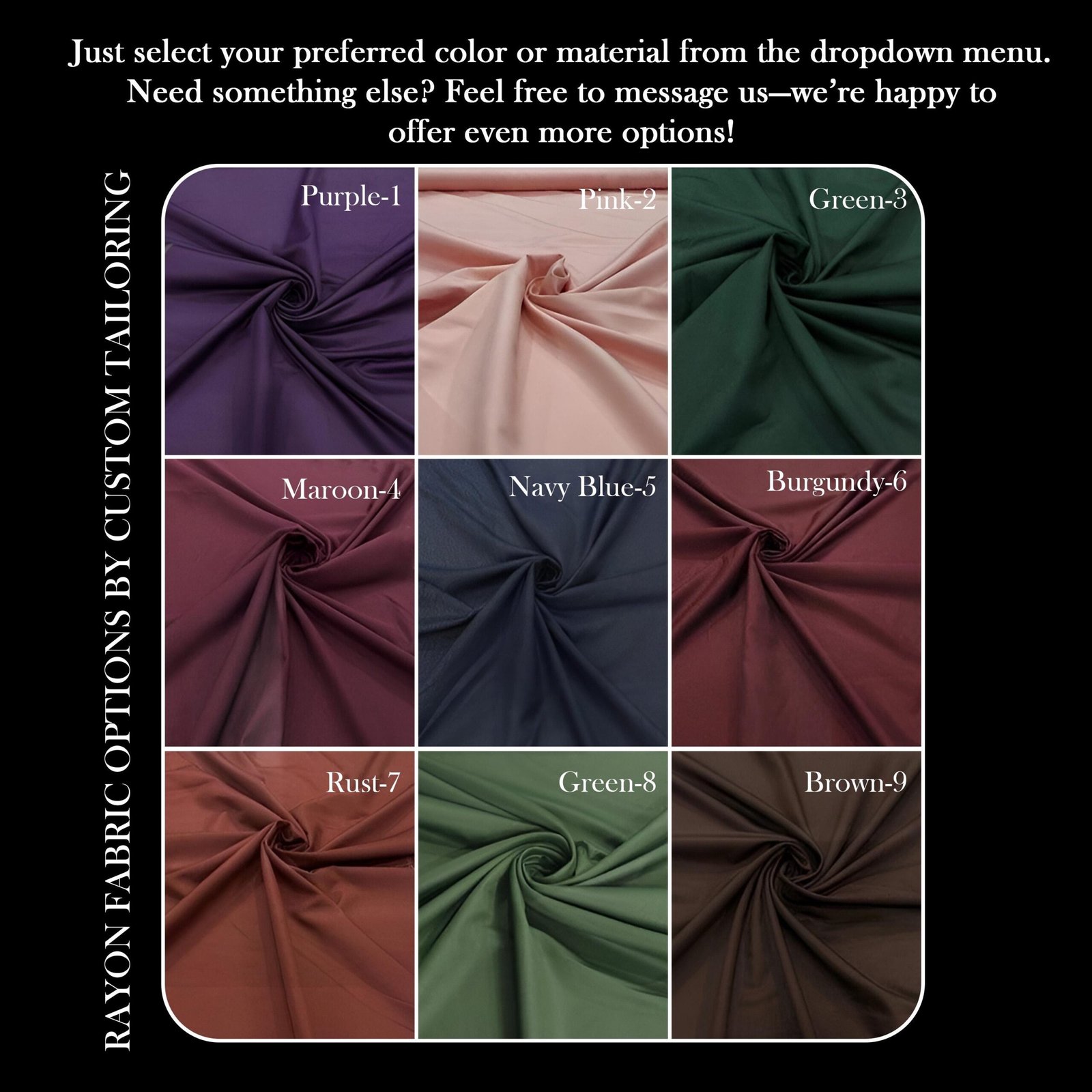 Same as in Picture ,Rayon Purple 1 ,Rayon Pink 2 ,Rayon Green 3 ,Rayon Maroon 4 ,Rayon Navy Blue 5 ,Rayon Burgundy 6 ,Rayon Rust 7 ,Rayon Green 8 ,Rayon Brown 9 ,Wool 1 ,Wool 2 ,Wool 3 ,Wool 4 ,Wool 5 ,Wool 6 ,Wool 7 ,Wool 8 ,Wool 9 |