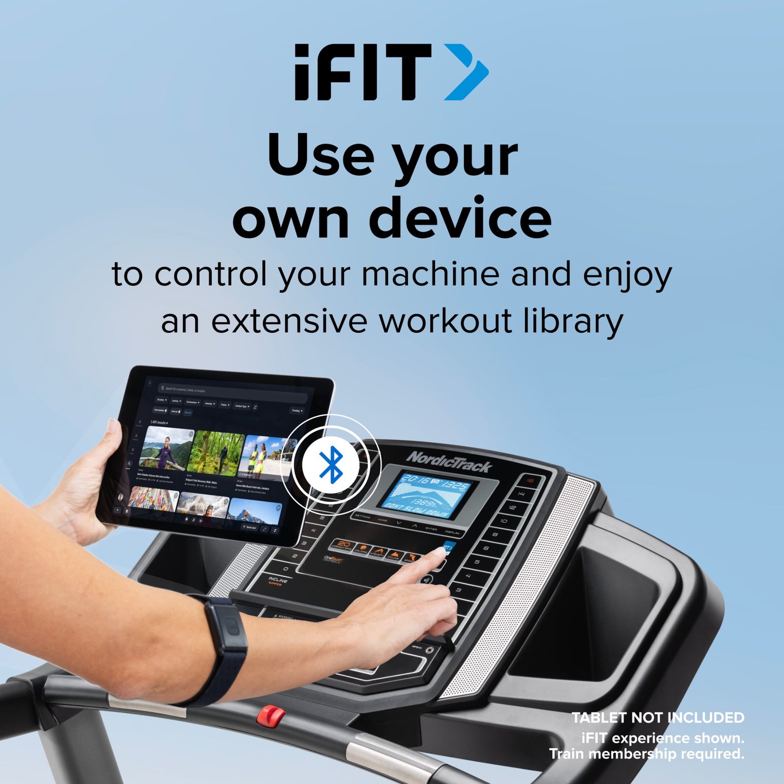 - See your live workout stats on the clear LCD display. Or use your own device on the shelf to follow iFIT Trainers. Train subscription required