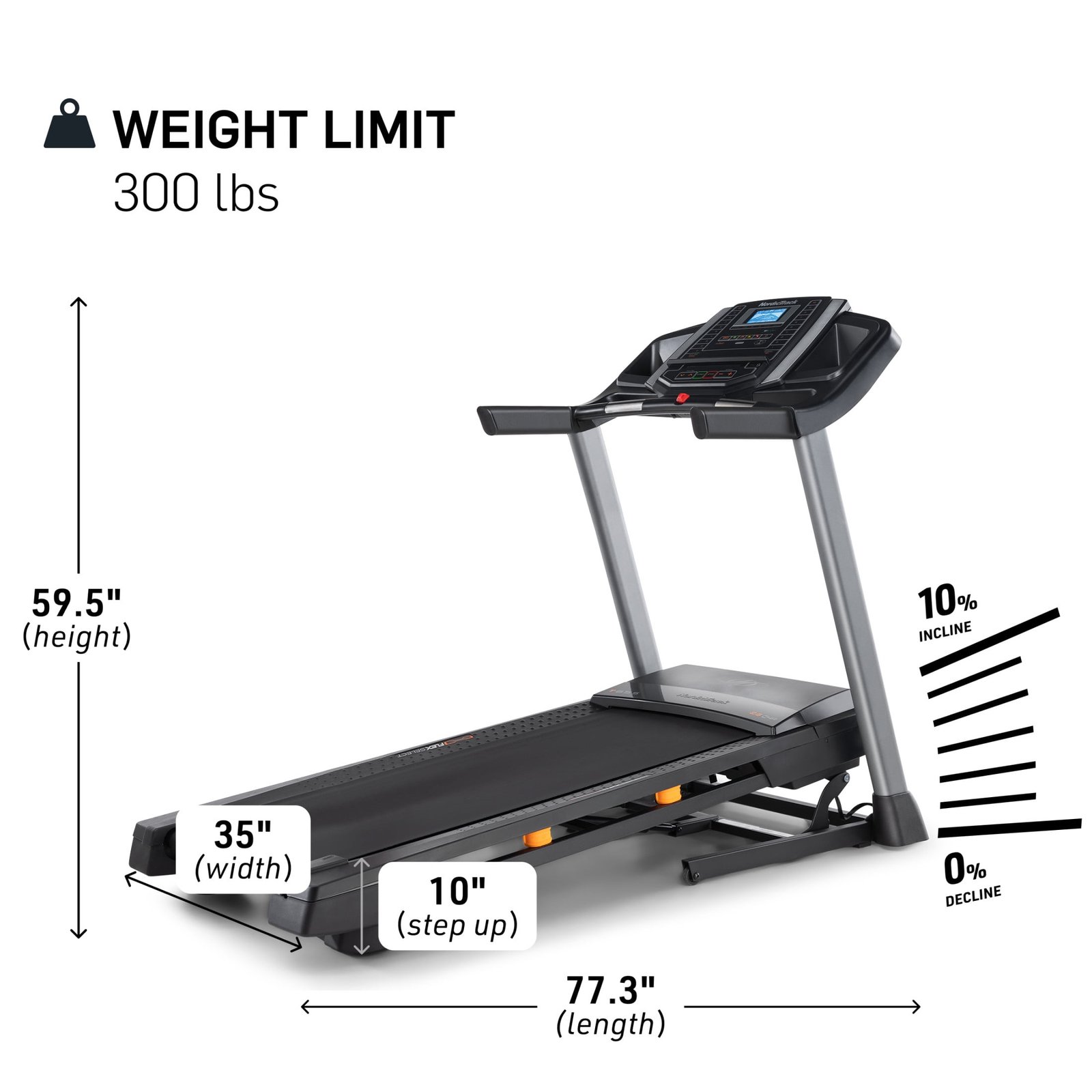 - 0-10% incline range supports your goals and training plans.