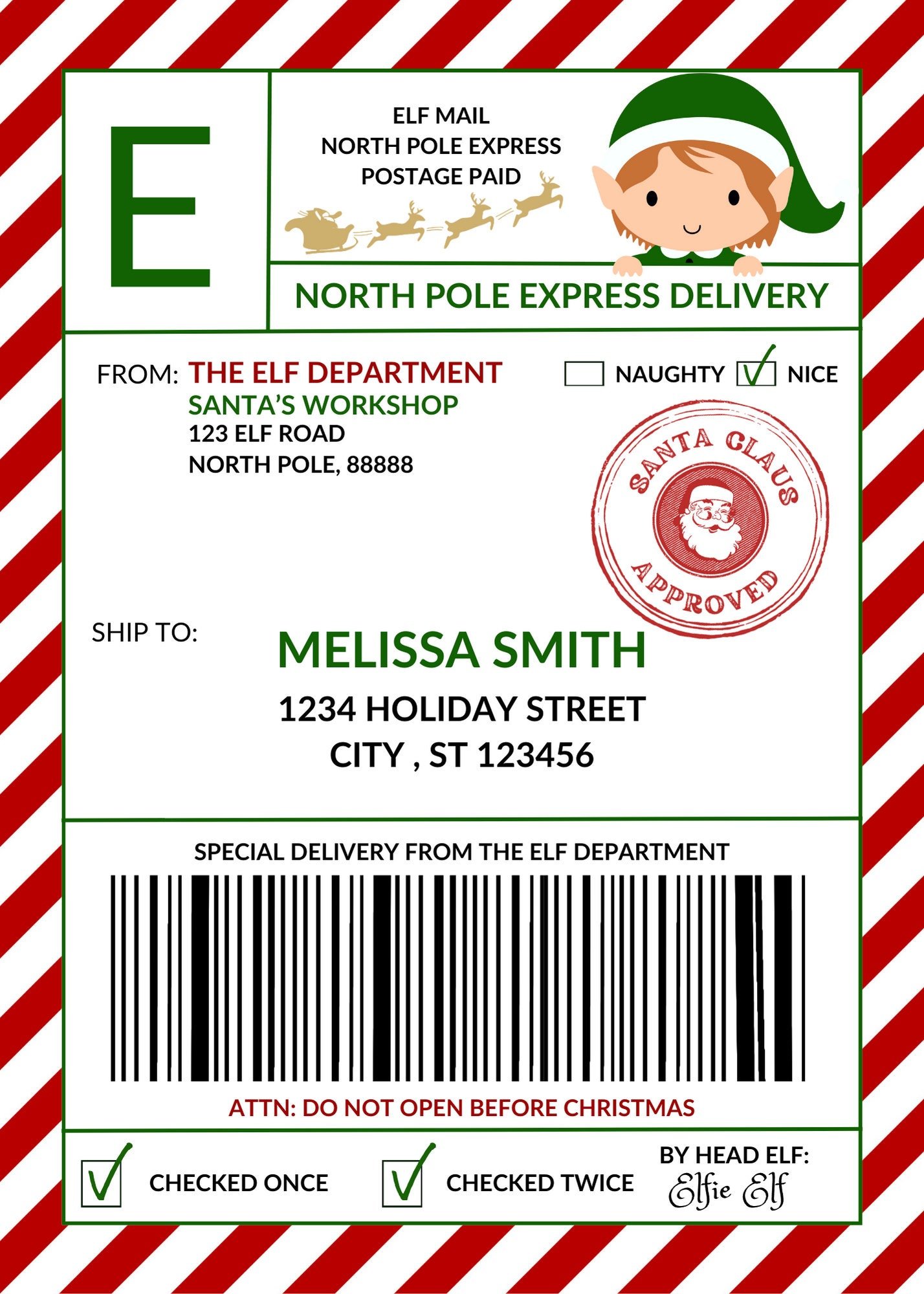 Editable elf mail shipping label. Add to the holiday fun with this North Pole package label from Santa. All the wording is editable. Simply add your child’s name and address. Print yourself or take/upload file to a local print shop and have them print. Print size is 5×7. Label is not formatted to fit on any actual shipping label.
