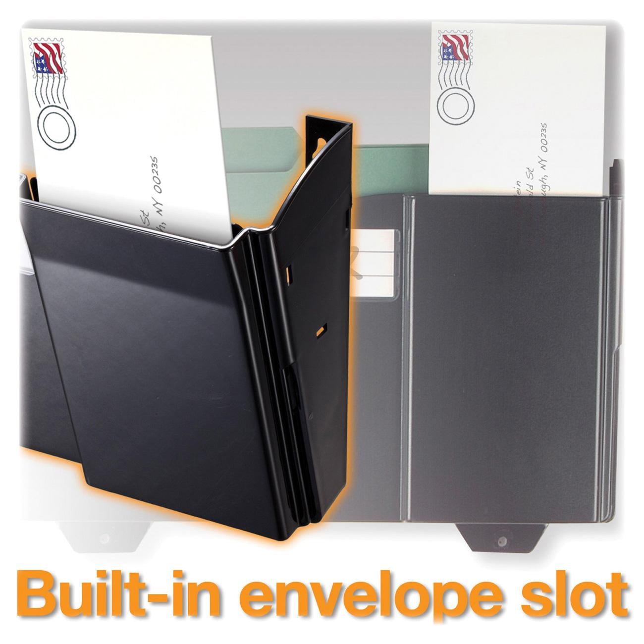 Add-on pocket holds letter-size, legal-size or A4-size documents or files. Special slots for envelopes or postcards allow easy retrieval. Snap onto Officemate Grande Central Filing Systems to expand the system. Labels for categorizing files are included.