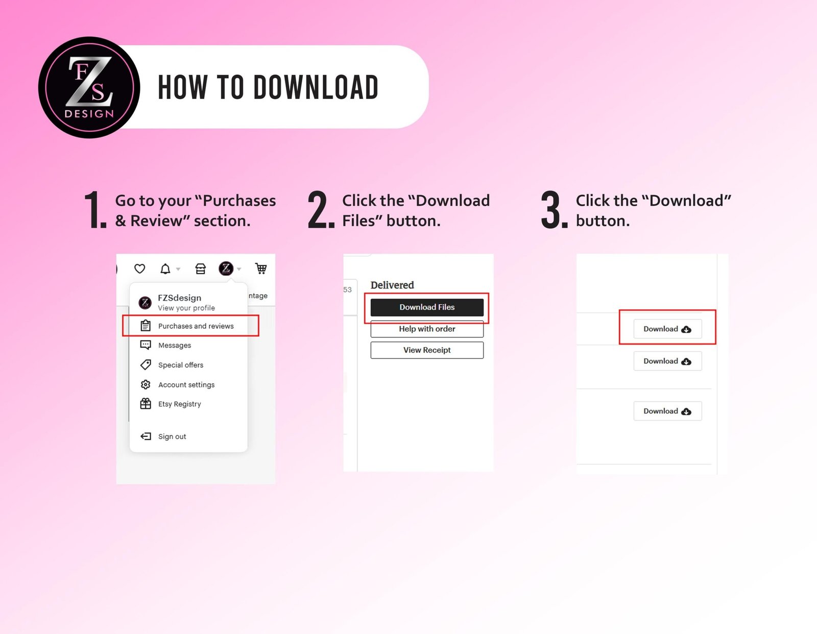 2. After you purchase the listing, you will receive an email from Etsy with your .PDF download, also you can download from Etsy “Purchases & Reviews” section.