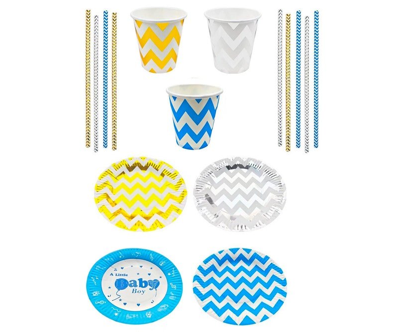 pack of 10 Chevron Paper table supplies: Straws, Cups, Plates Bridal Baby Shower Birthday Party 1 2 3 16 21 30 40 decor Silver Gold Blue