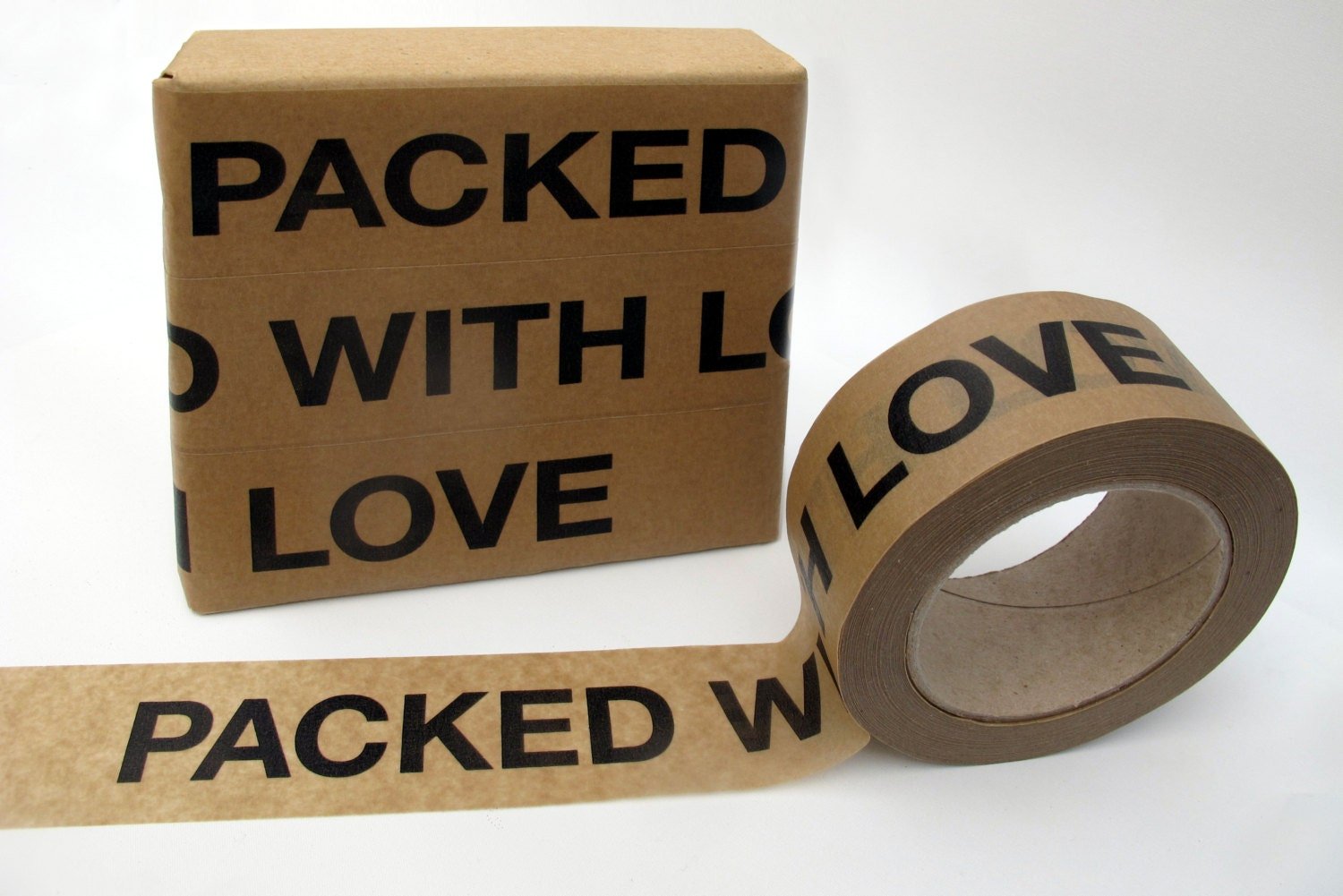 The original brown paper tape, black print PACKED WITH LOVE, 100% recyclable, 50 mm wide, 50 meters long – from pipapur