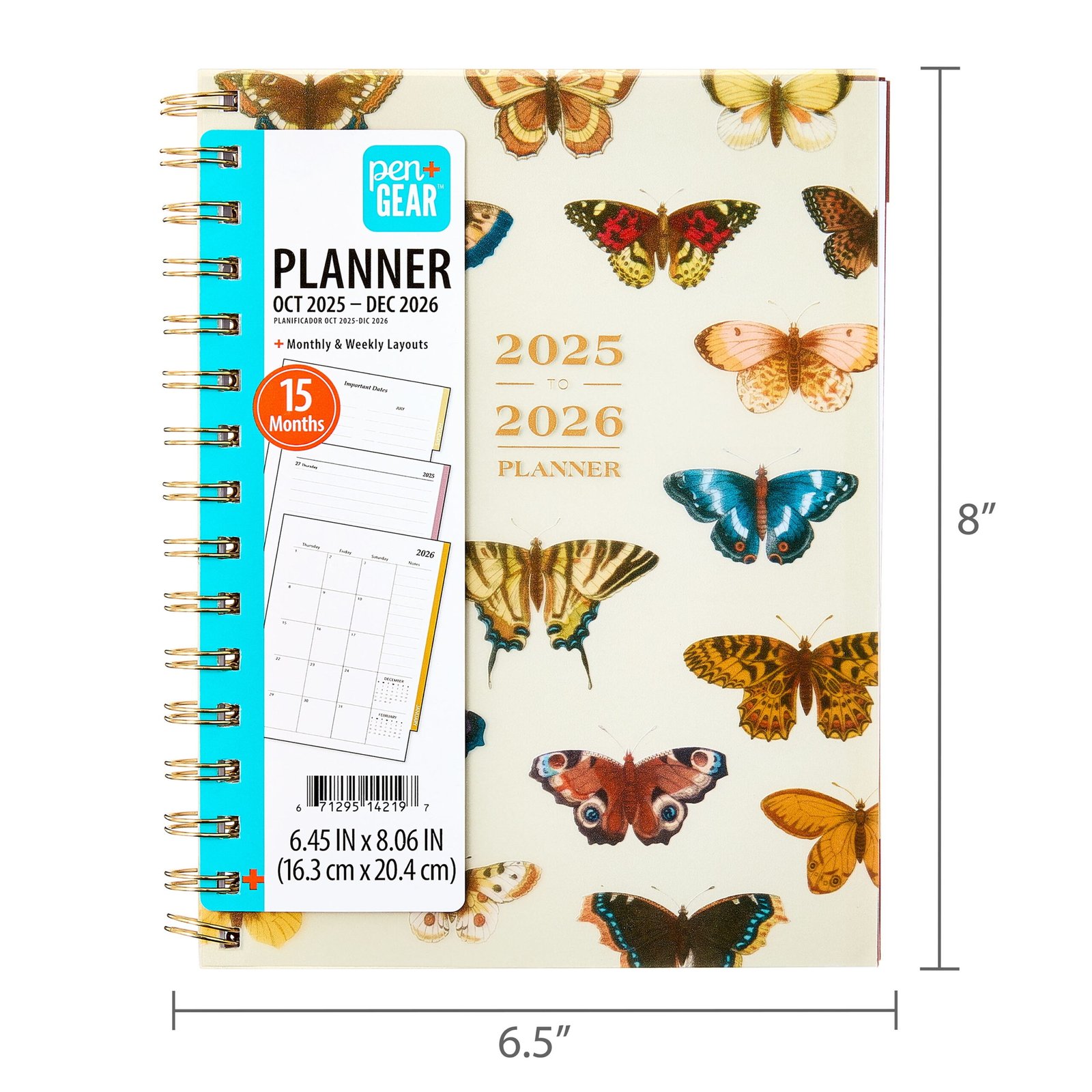 Pen+Gear 15-Month Monthly Planner, 6.45"e; x 8.06"e;, Multicolor Butterfly, October 2025-December 2026