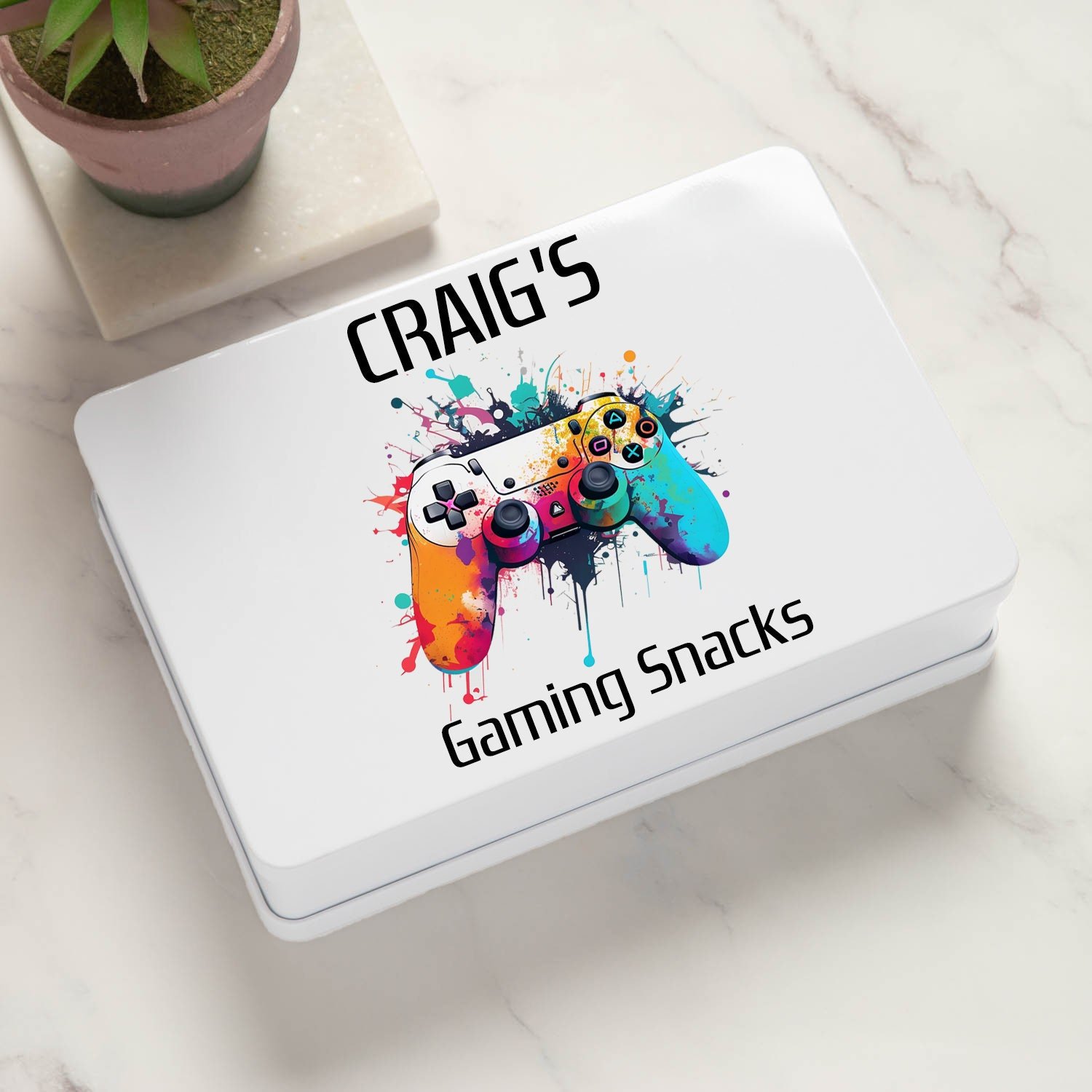Personalised Gaming Snacks White Metal Storage Tin Snacks Gifts Ideas Playstation Nintendo Xbox Board Games Birthday Christmas New Home