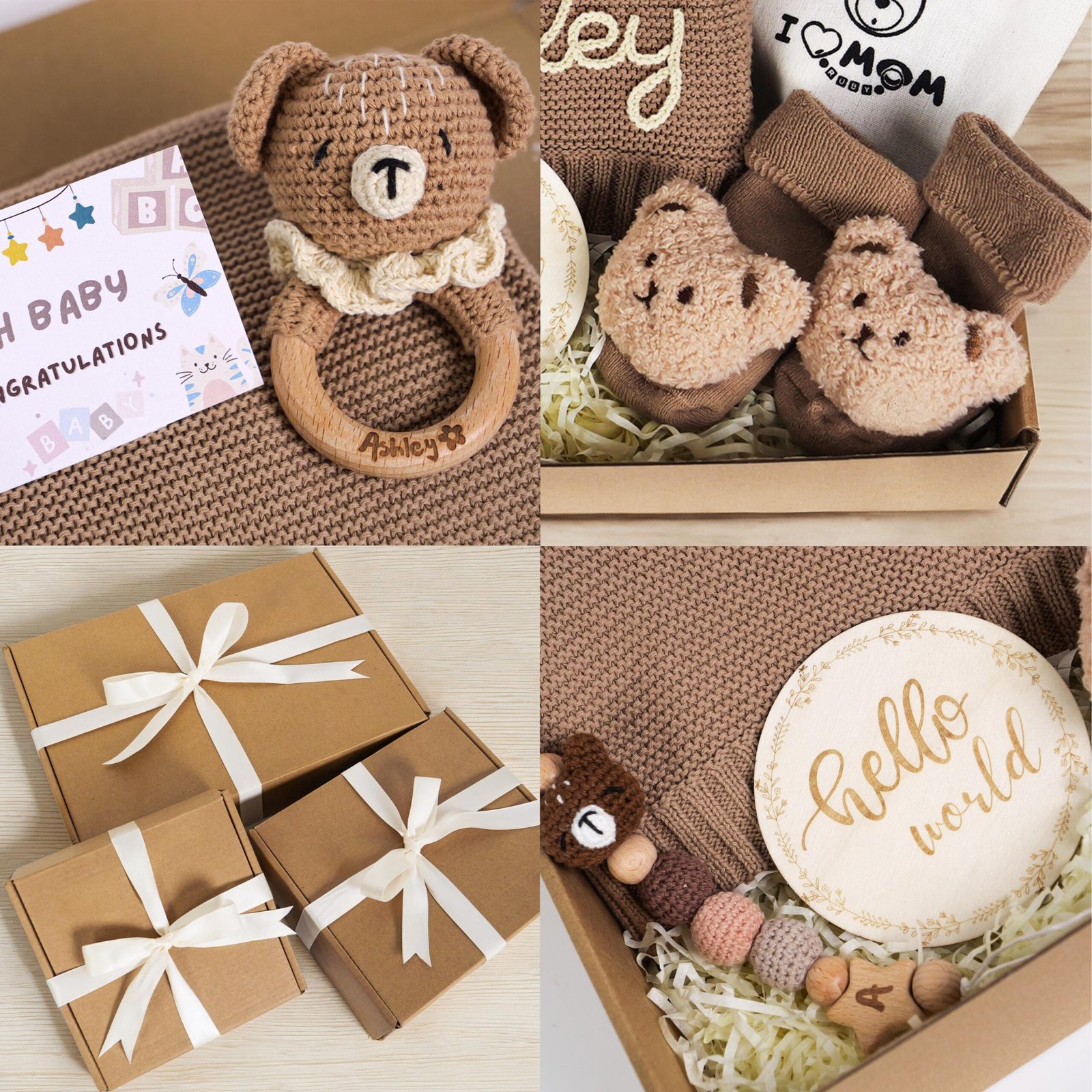 Personalized Baby Gift Set,Customized Newborn Baby Gift,Crochet Animal Rattle Chain with Name Engraving, Baby Shower Gift, New Baby Gift Set