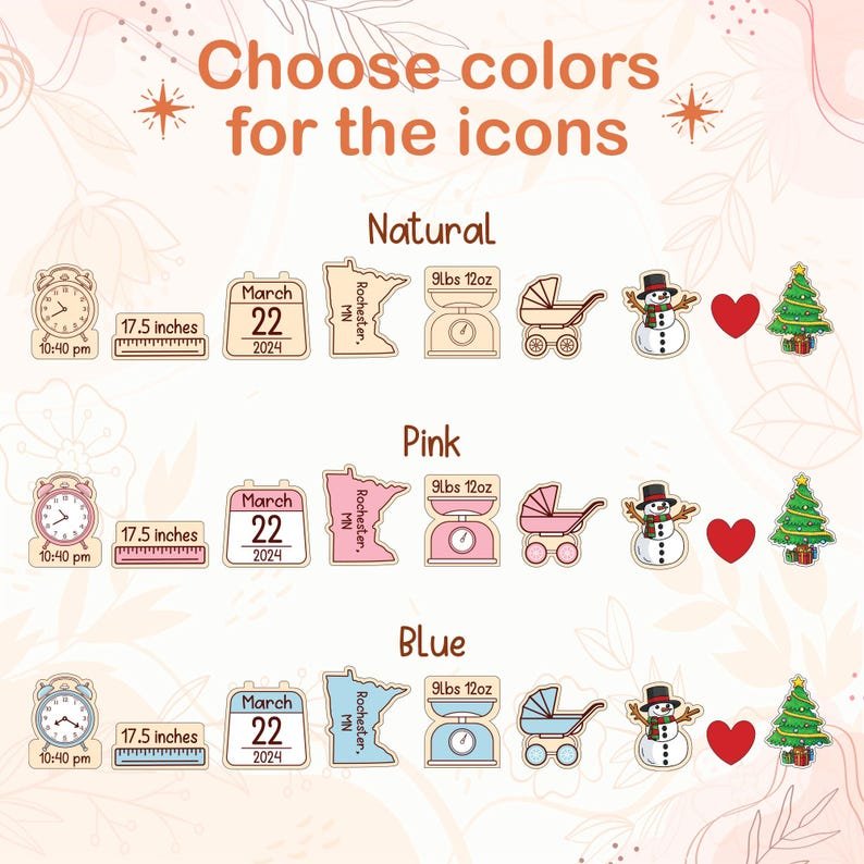 Please make sure to leave the list of information on separate lines for your baby Christmas ornament in the personalization box, and please double-check the spelling. By default, christmas tree, snowman and heart icons are available.