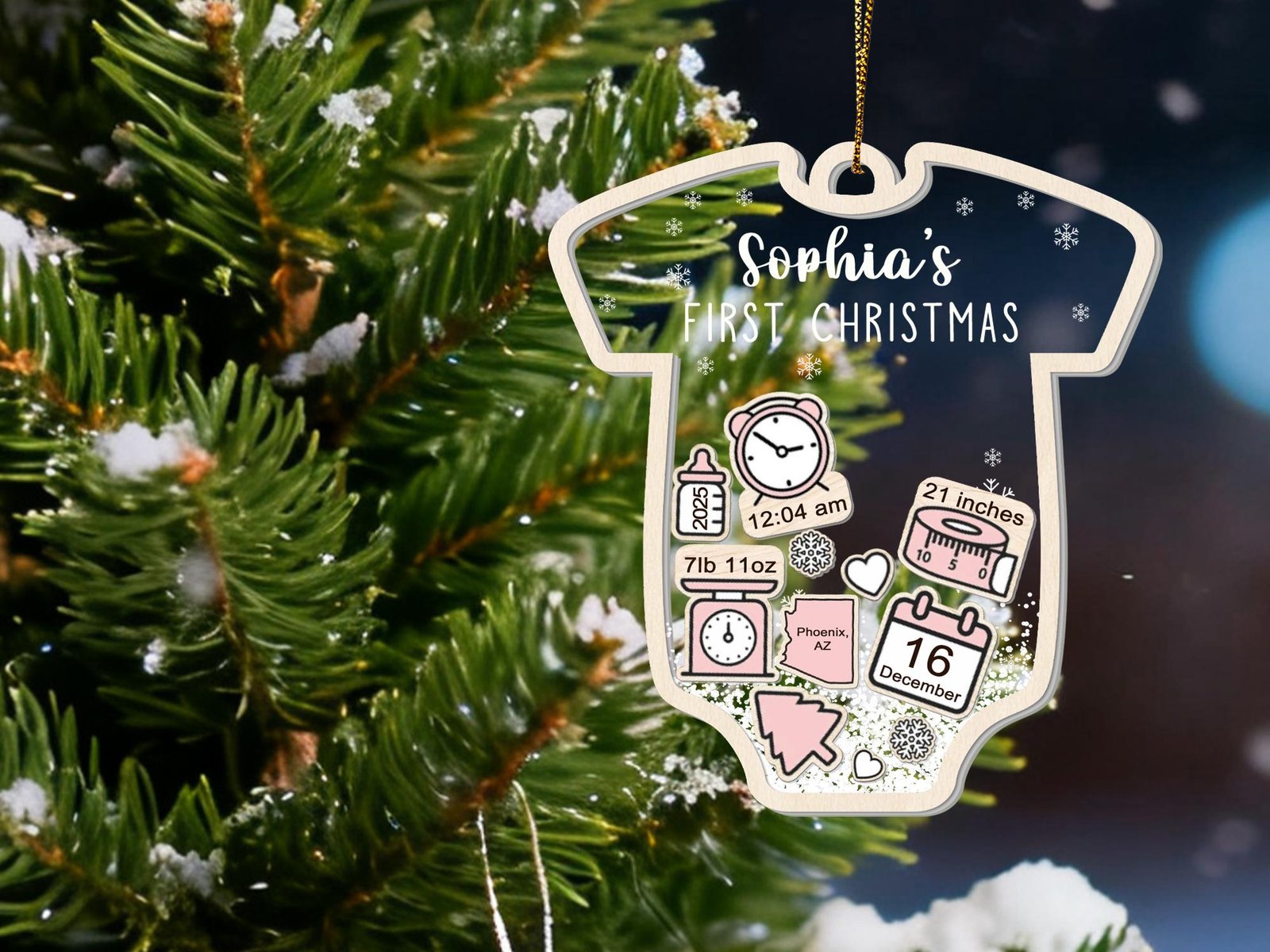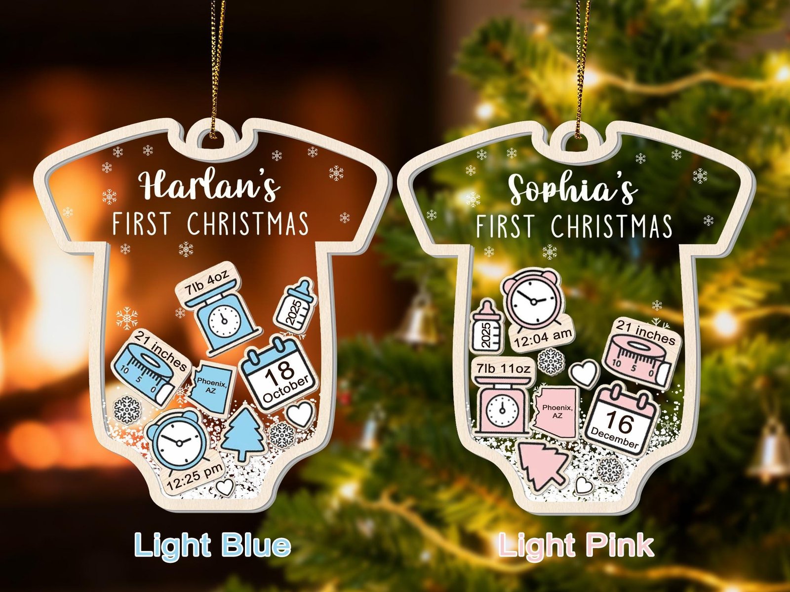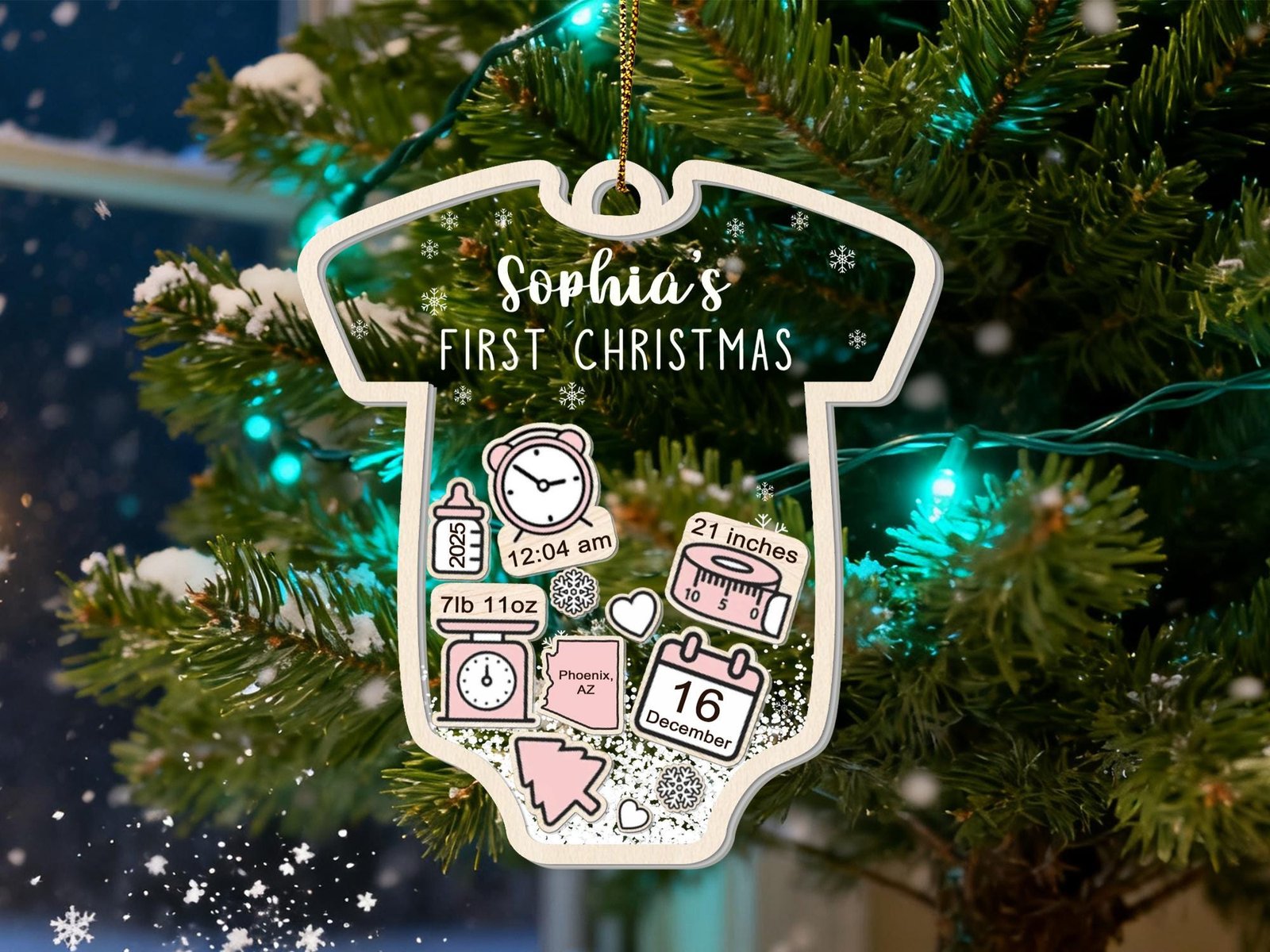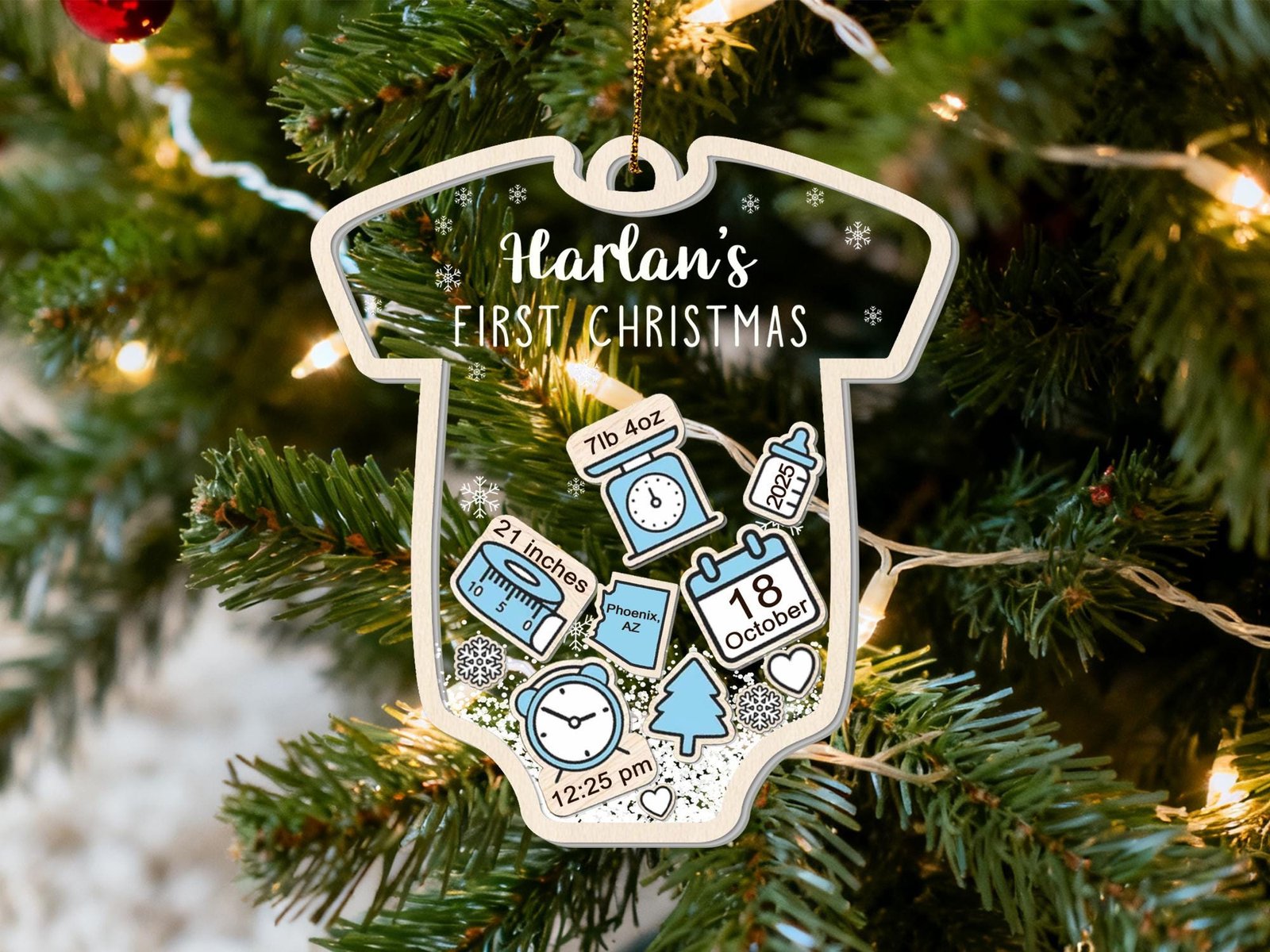 Please make sure to leave the list of information on separate lines for your baby Christmas ornament in the personalization box, and please double-check the spelling. By default, christmas tree, snow and heart icons are available.