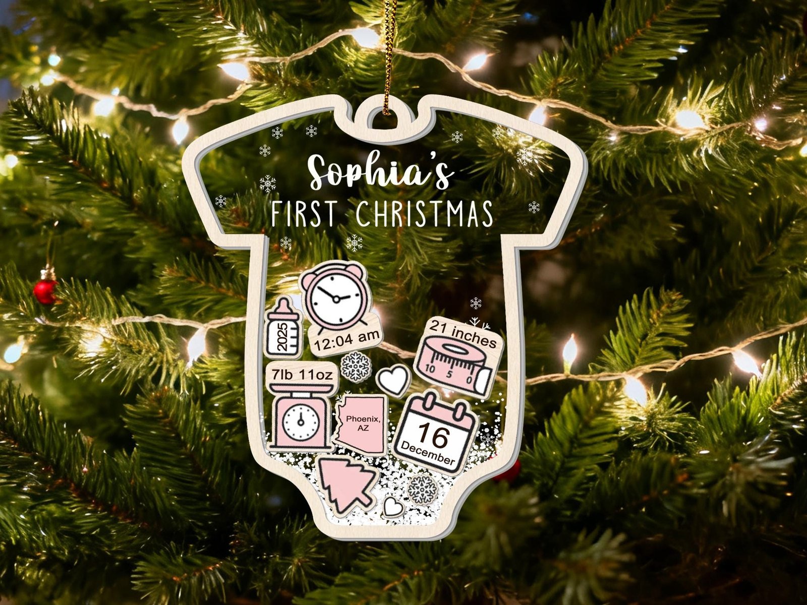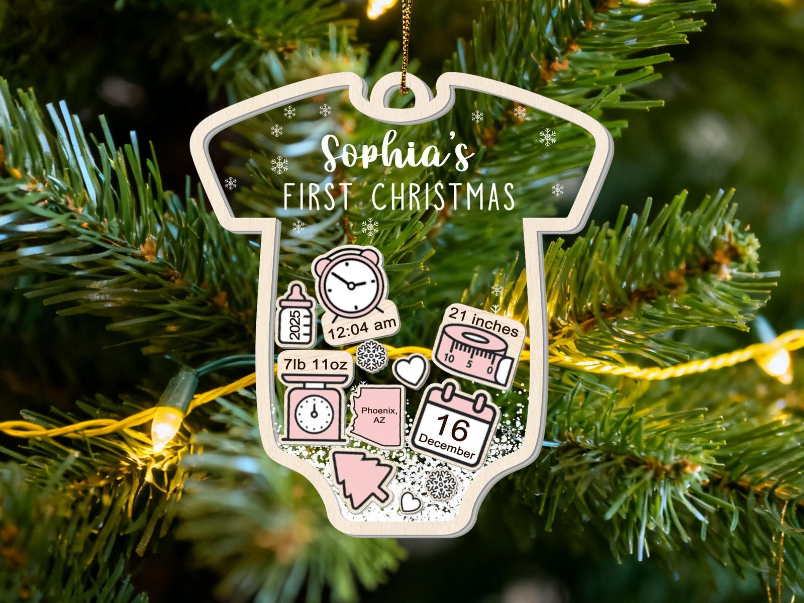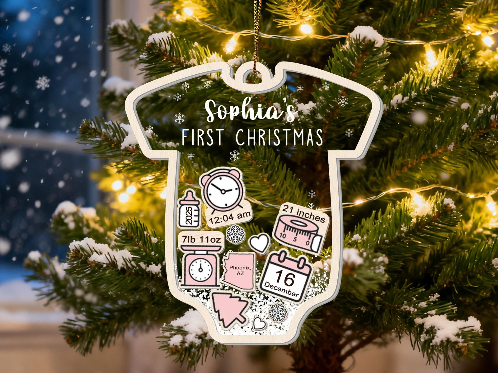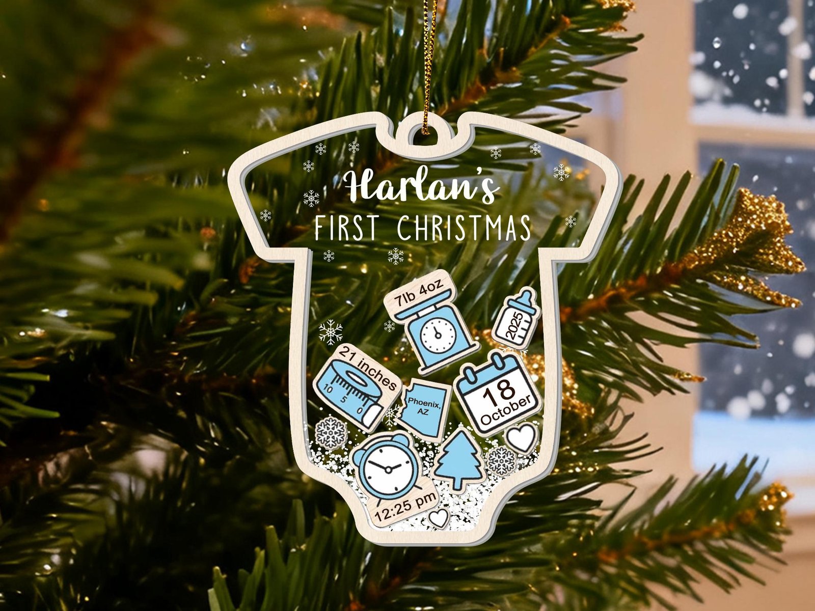 Please make sure to leave the list of information on separate lines for your baby Christmas ornament in the personalization box, and please double-check the spelling. By default, christmas tree, snow and heart icons are available.