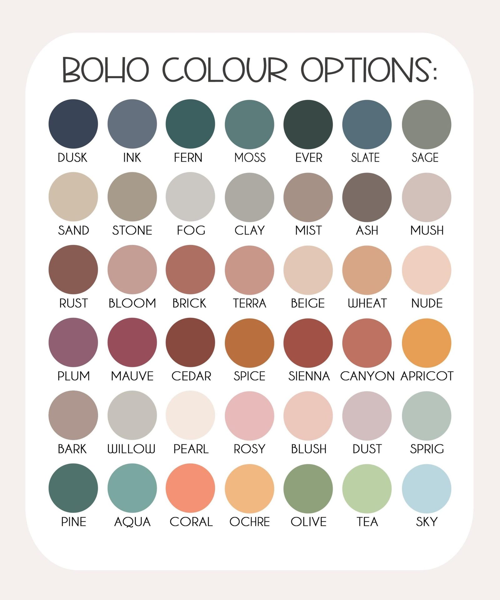 Dusk ,Ink ,Fern ,Moss ,Ever ,Slate ,Sage ,Sand ,Stone ,Fog ,Clay ,Mist ,Ash ,Mush ,Rust ,Bloom ,Brick ,Terra ,Beige ,Wheat ,Nude ,Plum ,Mauve ,Cedar ,Spice ,Sienna ,Canyon ,Apricot ,Bark ,Willow ,Pearl ,Rosy ,Blush ,Dust ,Sprig ,Pine ,Aqua ,Coral ,Ochre ,Olive ,Tea ,Sky |