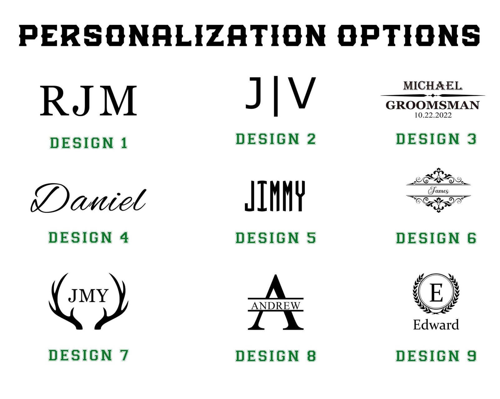 2 You can choose the design on the last picture. Please fill in the complete engraving information, eg: design 3, Michael, GROOMSMAN, 2023.11.2