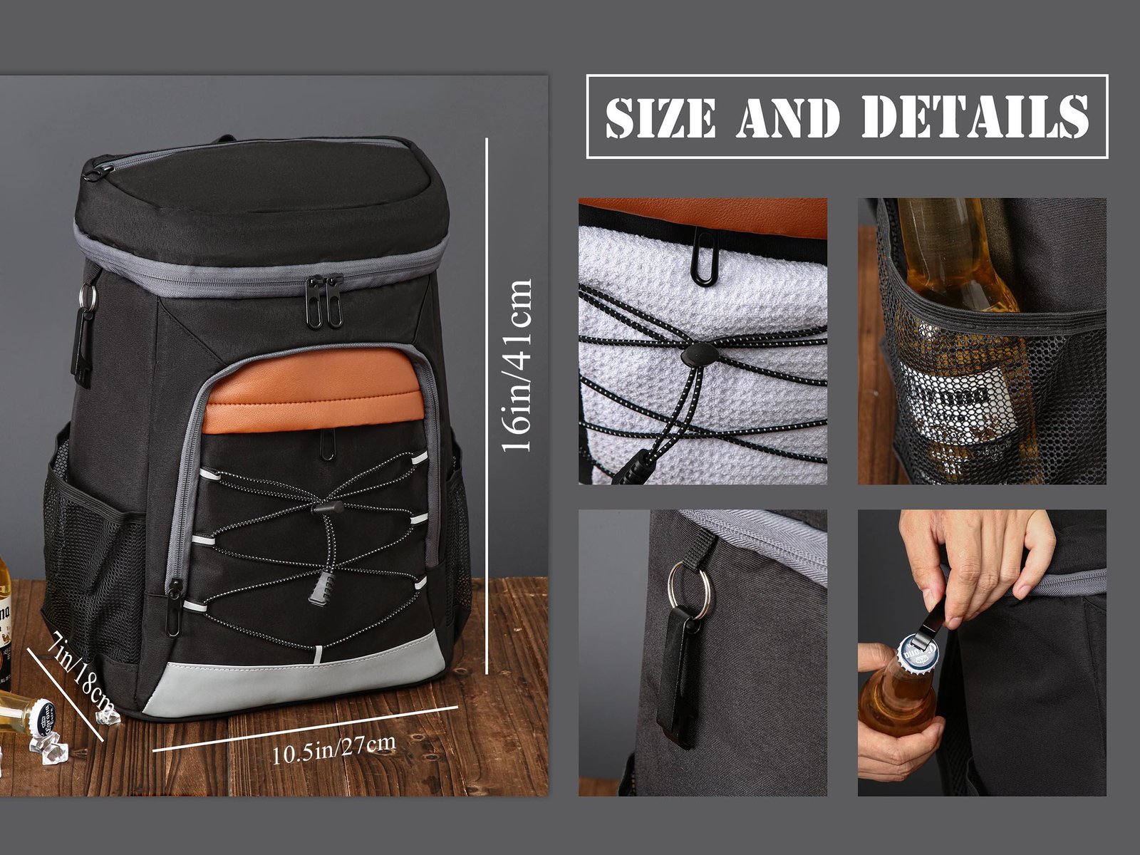 Our versatile and stylish cooler backpack is the perfect gift for the active man in your life. Crafted with waterproof materials, it ensures durability and functionality for outdoor adventures, sporting events, and cultural outings. The sturdy and durable top handle, along with the adjustable strap, provides convenience and comfort while carrying. Its dimensions of 10.6*7.1*16.1in/27*18*41cm make it highly portable and spacious enough to accommodate all your beverage cooling needs.